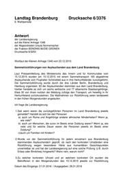 Landtag Brandenburg Drucksache 6/3376 6. Wahlperiode Antwort der Landesregierung auf die Kleine Anfrage 1348 der Abgeordneten Ursula Nonnemacher der Fraktion BÜNDNIS 90/DIE GRÜNEN Drucksache 6/3253 Wortlaut der Kleinen Anfrage 1348 vom 23.12.2015: Sammelrückführungen von Asylsuchenden aus dem Land Brandenburg Laut Pressemitteilung des Ministeriums des Innern und für Kommunales vom 15.12.2015 wurden am 15.12.2015 mit einem Sammeltransport 165 abgelehnte Asylsuchende vom Flughafen Schönefeld aus in ihre Herkunftsländer zurückgeführt. Die Sammelrückführung wurde durch die drei Länder Berlin, Brandenburg und Hamburg organisiert. 83 der Asylsuchenden stammten aus dem Land Brandenburg, hierbei handelte es sich um sechs serbische und 77 albanische Staatsangehörige. Etwa 30 von ihnen nutzten der Meldung zufolge den Transport, um freiwillig in ihr Herkunftsland zurückzukehren. Die Maßnahmen zur Rückführung seien landesweit in den frühen Morgenstunden angelaufen. Ich frage die Landesregierung: 1.Seit wann waren die zurückgeführten Personen im Land Brandenburg jeweils gemeldet? Handelt es sich bei den Personen a) auch um Roma und Angehörige anderer ethnischer Minderheiten? Wenn ja, wie viele? b) auch um Menschen, die zuvor im Besitz einer Duldung waren? Wenn ja, wie viele und für welche Dauer waren die Personen jeweils im Besitz einer Duldung? c)auch um Familien mit Kindern? 2.Wurde vor der Sammelrückführung für jede/n einzelne/n aus Brandenburg stammenden Asylsuchende/n geprüft, ob nach den konkreten Umständen eine Rückführung wegen besonderer Härte aus humanitären Gesichtspunkten unvertretbar ist und hat die Landesregierung auf eine solche Prüfung (z.B. durch Erlass oder Ähnliches) hingewirkt? Wenn nein, warum nicht? 3.Zu welcher konkreten Uhrzeit und an welchem konkreten Ort wurden die Betroffenen in den Morgenstunden des 15.12.2015 jeweils zur Rückführung