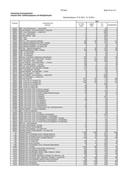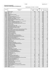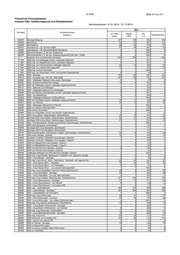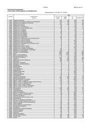 PD Nord Seite 23 von 211 Polizeiliche Kriminalstatistik erfasste Fälle, Aufklärungsquote und Häufigkeitszahl Berichtszeitraum: 01.01.2014 - 31.12.2014 2014 Schlüssel Kurzbezeichnung erf. Fälle aufgekl. Aq Schlüssel Haufigkeitszahl insges. Fälle in % 674020 Gemeinschädl. Sachb. (ohne 674320) 44 5 11,4 12 674021 Gemeinschädl. Sachb. durch Graffiti (ohne 674321) 15 3 20,0 4 674022 Gemeinschädl. Sachb. durch Feuer (ohne 674322) 3 0 0,0 1 674029 Sonstige gemeinschädl. Sachb. (ohne 674329) 26 2 7,7 7 674030 Zerstörung von Bauwerken (ohne 674330) 1 0 0,0 0 674100 Sachbeschädigung an Kfz 696 198 28,4 183 674111 Sachbeschädigung durch Graffiti an Kfz 12 2 16,7 3 674119 Sonstige Sachbeschädigung an Kfz 684 196 28,7 180 674200 Datenveränderung, Computersabotage 39 2 5,1 10 674210 Datenveränderung 2 1 50,0 1 674220 Computersabotage 37 1 2,7 10 674300 Sonstige Sachb. auf Straßen, Wegen oder Plätzen 381 103 27,0 100 674310 Sonst. Sachb. auf Straßen/Wegen/Plätzen gemäß § 303 StGB 321 89 27,7 84 674311 Sonst. Sachb. durch Graffiti auf Straßen/Wegen/Plätzen 88 8 9,1 23 674312 Sonst. Sachb. durch Feuer auf Straßen/Wegen/Plätzen 14 6 42,9 4 674319 Sonstige Sachb. auf Straßen/Wegen/Plätzen 219 75 34,2 58 674320 Gemeinschädl. Sachb. auf Straßen/Wegen/Plätzen 60 14 23,3 16 674321 Gemeinschädl. Sachb. durch Graffiti auf Straßen/Wegen/Plätzen 10 1 10,0 3 674322 Gemeinschädl. Sachb. durch Feuer auf Straßen/Wegen/Plätzen 0 0 0,0 0 674329 Sonstige gemeinschädl. Sachb. auf Straßen/Wegen/Plätzen 50 13 26,0 13 674500 Zerstörung wichtiger Arbeitsmittel 4 3 75,0 1 674519 Sonstige Zerstörung wichtiger Arbeitsmittel 4 3 75,0 1 675000 Sprengstoff- und Strahlungsverbrechen 21 7 33,3 6 675200 Herbeiführen einer Sprengstoffexplosion 21 7 33,3 6 676000 Straftaten gg. die Umwelt 57 26 45,6 15 676010 Bodenverunreinigung 21 7 33,3 6 676011 Bodenverunreinigung 324a StGB 20 6 30,0 5 676012 Bodenverunreinigung - besonders schwerer Fall 1 1 100,0 0 676100 Gewässerverunreinigung 13 2 15,4 3 676101 Gewässerverunreinigung § 324 StGB 13 2 15,4 3 676200 Luftverunreinigung 1 1 100,0 0 676201 Luftverunreinigung § 325 StGB 1 1 100,0 0 676400 Unerlaubter Umgang mit gefährlichen Abfällen 12 7 58,3 3 676410 Unerl. Umgang mit Abfällen 12 7 58,3 3 676411 Unerl. Umgang mit Abfällen § 326 Abs. 1 11 7 63,6 3 676412 Unerl. Umgang mit Abfällen § 326 Abs. 1 - bes. schw. Fall 1 0 0,0 0 676500 Unerlaubtes Betreiben von Anlagen 7 7 100,0 2 676520 Unerl. Betreiben von Anlagen 7 7 100,0 2 676521 Unerl. Betreiben von Anlagen § 327 Abs. 2 7 7 100,0 2 676522 Unerl. Betreiben von Anlagen § 327 Abs. 2 - bes. schw. Fall 0 0 0,0 0 676600 Unerl. Umgang mit radioaktiven Stoffen und anderen gef. Gütern 2 1 50,0 1 676620 Unerl. Umgang mit anderen gefährl. Stoffen und Gütern 2 1 50,0 1 676621 Unerl. Umgang mit anderen gefährl. Stoffen und Gütern § 328 Abs. 3 StGB 2 1 50,0 1 676622 Unerl. Umgang mit anderen gefährl. Stoffen und Gütern - bes. schw. Fall 0 0 0,0 0 676800 Abfallein- / -aus- und -durchfuhr gemäß § 326 Abs. 2 StGB 1 1 100,0 0 676810 Ungeneh. Einfuhr von Abfällen § 326 Abs. 2 StGB 0 0 0,0 0 676811 Ungeneh. Einfuhr von Abfällen 0 0 0,0 0 676820 Ungeneh. Ausfuhr von Abfällen § 326 Abs. 2 StGB 1 1 100,0 0 676821 Ungeneh. Ausfuhr von Abfällen 1 1 100,0 0 676900 Schwere Gefährdung durch Freisetzen von Giften § 330a StGB 0 0 0,0 0 678000 Ausspähen von Daten 23 8 34,8 6 678010 Ausspähen von Daten gemäß § 202a StGB 21 7 33,3 6 678030 Vorbereiten des Ausspähens und Abfangens von Daten 2 1 50,0 1 679000 Weitere Straftaten mit Umweltrelevanz 1 0 0,0 0 679010 Herbeiführen einer Überschwemmung 1 0 0,0 0 700000 Strafrechtliche Nebengesetze 1.582 1.453 91,8 416 710000 ST gg. strafrechtl. Nebengesetze auf dem Wirtschaftssektor 74 61 82,4 19 712000 Straftaten nach AktG, GenG, GmbHG, HGB, RechnungslegungsG, UmwandlungsG, InsO 18 18 100,0 5 712020 Handelsgesetzbuch 0 0 0,0 0 712030 GmbH-Gesetz 0 0 0,0 0 712200 Insolvenzverschleppung § 15a InsO 18 18 100,0 5 713000 Delikte i.Z.m. Schwarzarbeitsbekämpfungs- und Arbeitnehmerüberlassungsgesetz 3 2 66,7 1 713010 Arbeitnehmerüberlassungsgesetz 3 2 66,7 1 715000 ST i.Z.m. Urheberrechtsbestimmungen 27 23 85,2 7 715010 Markengesetz 2 2 100,0 1 715040 Kunsturheberrechtsgesetz 18 17 94,4 5 715050 UHG -sonstige Verstöße- (ohne Schl. 715100 u. 725200) 6 3 50,0 2 715200 Softwarepiraterie in Form gewerbsmäßigen Handelns 1 1 100,0 0 716000 ST i.Z.m. Lebensmitteln (z.B. Lebensmittel- und Futtermittelgesetzbuch) 10 9 90,0 3 716079 Sonst. ST i.Z.m. Lebensmitteln - soweit nicht u. a. Schl. zu erf. - 0 0 0,0 0 716100 ST nach dem Lebensmittel- und Bedarfsgg.ständegesetz 2 2 100,0 1 716200 ST nach dem Arzneimittelgesetz 8 7 87,5 2 716210 ST nach dem AMG gemäß § 95 7 6 85,7 2 716212 Inverkehrbr., Verschreib. bei Dritten v. Arzneimitteln zu Doping im Sport 1 1 100,0 0 716213 Unerl. Handel, Abgabe, Bezug von verschreibungspflichtigen Arzneimitteln 2 1 50,0 1 716219 Sonstige ST nach dem AMG gemäß § 95 4 4 100,0 1 716220 ST nach dem Arzneimittelgesetz gemäß § 96 AMG 1 1 100,0 0