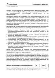 27. Sitzung am 25. Oktober 2018 Az.: GSIT-PLR-22001/1#24 Grundlage für einen effizienten und fehlerfreien Austausch zwischen den Ländern, einen einfachen und schnellen Zugriff auf Sitzungsunterlagen und perspektivisch für den Einsatz von länderübergreifenden, DMS-unabhängigen „Kalender-Services“ für das Regierungshandeln. Die besondere Bedeutung des Vorhabens für Bund, Länder und Kommunen ergibt sich aus diesem Paradigmenwechsel beim Dokumentenaustausch: Weg von E-Mail, Fileservern und fehlenden Metadaten hin zu einem XML-basierten Standard und einer synchronen und medienbruchfreien Kopplung der beteiligten DMS- und VBS-Systeme über das DVDV 2.0. Das Projekt folgt damit dem Leitgedanken von Steuerungsprojekten, nach dem „der sukzessive Auf- und Ausbau föderaler, gemeinsam nutzbarer IT-Infrastrukturkomponenten“ vorangetrieben werden soll. Die Ergebnisse des Vorhabens lassen darüber hinaus Verbesserungen der Wirtschaftlichkeit für den Bund, die Länder und Kommunen auf den folgenden Handlungsfeldern erwarten: 1) Reduktion manueller Tätigkeiten durch die interoperable Nutzung von Dokumentenmanagementsystemen auf Basis eines gemeinsamen Standards für das Regierungshandeln 2) Reduktion aufwändiger und fehleranfälliger manueller Pflege und Nacherfassung der Metadaten der bereitgestellten Dokumente 3) Optimierte Nutzung gemeinsamer Dateninfrastrukturen (Verbindungsnetz) in Verbindung mit dem deutschen Verwaltungsdienstverzeichnis DVDV 2.0 4) Projektergebnisse sind die Grundlage für weitere Anwendungsszenarien, wie die kooperative Nutzung und Weiterentwicklung eines interoperablen standardisierten Webkalenders mit CMIS Grundfunktionalitäten 5) Über den zu erstellenden Leitfaden für vergleichbare Umsetzungsprojekte (Profilierung XDomea und Schnittstellenanbindung über das DVDV 2.0) wird die Grundlage für eine vereinfachte und damit wirtschaftlichere Umsetzung des Standards „XDomea“ in anderen Verwaltungsbereichen geschaffen. Darüber hinaus ermöglichen die Ergebnisse des Standardisierungsvorhabens die Umsetzung des Beschluss 2017/39 zur verbindlichen Einführung des XDomea-Standards für die eingesetzten IT-Verfahren im Regierungshandeln. Die Grobplanung des Vorhabens geht von einem erforderlichen Budget in Höhe von ca. 200.000 Euro aus, das aus Restmitteln 2018 finanziert werden soll, und einer Laufzeit von 15 bis 18 Monaten. Die Werte werden anlässlich der Mittelbeantragung konkretisiert. Sollten keine Restmittel verfügbar sein oder dem Steuerungsprojekt zugeteilt werden können, werden reguläre Mittel für das Jahr 2020 beantragt. Zudem prüft Hessen die Möglichkeit, den Beginn der Projektarbeiten im Jahr 2019 aus eigenen Mitteln anzuschieben. Fachliche Betroffenheit der Fachministerkonferenzen: Ja x Nein Gemäß § 1 Abs. 6 des IT-Staatsvertrags werden die Fachministerkonferenzen vom IT-Planungsrat beteiligt, sofern deren Fachplanungen von seinen Entscheidungen betroffen sind.
