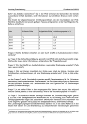Landtag Brandenburg Drucksache 6/6683 1 bahn“ als Zeitreihe recherchiert. Da in der PKS territorial die Gemeinden die kleinste auswertbare Einheit darstellen, sind Informationen zu betroffenen Brücken nicht vorhan- den. Die Anzahl der abgeschlossenen Ermittlungsverfahren, die den Grundsätzen der PKS- Richtlinie des BKA in der jeweils gültigen Fassung entsprechen, ist der nachfolgenden Ta- belle zu entnehmen. Jahr Erfasste Fälle Aufgeklärte Fälle Aufklärungsquote in % 2012 14 4 28,6 2013 31 1 3,2 2014 60 2 3,3 2015 30 0 0,0 2016 25 0 0,0 Frage 2: Welche Schäden entstehen pro Jahr durch Graffiti an Autobahnbrücken in Bran- denburg? zu Frage 2: Da die Sachbeschädigung generell in der PKS nicht als Schadensdelikt einge- stuft wurde, liegen keine Informationen entsprechend der Fragestellung vor. Frage 3: Wird bei Graffiti an Autobahnbrücken regelmäßig Strafanzeige erstattet? (Falls nein, warum nicht?) Frage 4: Gibt es Kriterien hinsichtlich Art, Größe oder Inhalt der Motive, Symbole oder Schriftzeichen, die beeinflussen, ob eine Strafanzeige erstattet wird? (Falls ja, bitte erläu- tern) zu den Fragen 3 und 4: Grundsätzlich werden gemäß Dienstanweisung Nr. 54 „Schadens- bearbeitung des Landesbetriebes Straßenwesen“ bei Sachbeschädigungen an Bestandtei- len der Autobahn, Bundes- und Landesstraßen bzw. am Eigentum des LS Strafanzeigen gestellt (Schadensanzeige). Frage 7: In wie vielen Fällen in den vergangenen fünf Jahren kam es pro Jahr aufgrund welcher Delikte jeweils zu einer Verurteilung? Wie ist die Verurteilungsquote in Prozent? zu Frage 7: Grundsätzlich werden derartige Straftaten als „Sachbeschädigungen“ gemäß § 303 Abs.1 des Strafgesetzbuches klassifiziert und nur auf Antrag, bzw. wenn die Straf- verfolgungsbehörde wegen des besonderen öffentlichen Interesses ein Einschreiten von Amts wegen für geboten hält (§ 303c des Strafgesetzbuches), strafrechtlich verfolgt. Der Landesregierung liegen keine Erkenntnisse darüber vor, in wie vielen Fällen es in den letzten fünf Jahren im Land Brandenburg zu entsprechenden Verurteilungen gekommen 1 Die Erfassung von Tatörtlichkeiten erfolgt fakultativ (keine Pflichtfeld oder Plausibilitätsnachweis), so dass nicht von Vollständigkeit der Fall- und Zeitreihe ausge- gangen werden kann. Eine Recherche mit den Begriffen „Autobahn“ und „Brücke“ erbrachte einen Nullbestand für den kompletten Recherchezeitraum. -2-