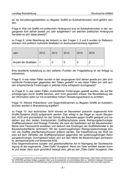 Landtag Brandenburg Drucksache 6/6683 ist, da Verurteilungsstatistiken zu illegalen Graffiti an Autobahnbrücken nicht geführt wer- den. Frage 8: Wie viel Graffiti mit politischem Hintergrund sind an Autobahnbrücken in den ver- gangenen fünf Jahren jeweils pro Jahr aufgetreten? Um welchen politischen Hintergrund handelte es sich dabei jeweils? zu Frage 8: Unter Beachtung der Antwort zu den Fragen 1, 5 und 6 wurden im Referenz- 2 zeitraum drei politisch motivierte Straftaten im Sachzusammenhang registriert. Jahr 2012 2013 2014 2015 2016 Anzahl der Straftaten 1 0 0 0 2 Eine dezidierte Aufstellung zu den weiteren Punkten der Fragestellung ist der Anlage zu entnehmen. Frage 9: In wie vielen Fällen wurden in den vergangenen fünf Jahren jeweils pro Jahr zivil- rechtliche Forderungen gegenüber den Tätern gestellt? In wie vielen Fällen pro Jahr wur- den entsprechende Forderungen in welcher Höhe erfolgreich durchgesetzt? zu Frage 9: In wie vielen Fällen zivilrechtliche Forderungen gestellt wurden, die auf Be- schädigungen durch Graffiti beruhen, wird nicht gesondert erfasst. Die Bereitstellung die- ser Information wäre nur mit unvertretbar hohem Verwaltungsaufwand zu ermitteln. Frage 10: Welche Präventions- und Gegenmaßnahmen zu illegalen Graffiti an Autobahn- brücken werden in Brandenburg ergriffen? zu Frage 10: Aus technischer Sicht können an Bauwerken präventiv sogenannte Anti- Graffiti-Systeme (AGS) aufgebracht werden. Das erfolgt in der Regel an neuen Bauwer- ken. AGS sind grundsätzlich für den Schutz der Bauwerke gegen Graffiti geeignet und be- stehen aus den beiden Komponenten Graffitiprophylaxe sowie Reinigungstechnologie. Graffitiprophylaxen sind flüssige Produkte, die nach der Applikation auf der Bauwerksober- fläche eine Trennschicht ausbilden und dadurch das Eindringen der Graffitifarbmittel in die Bauwerksoberfläche verhindern. Mit der systemzugehörigen Reinigungstechnologie kön- nen die Graffitis oberflächenschonend entfernt werden. Die Klassifizierung der AGS ba- siert auf dem Verhalten der Graffitiprophylaxen gegenüber der systemzugehörigen Reini- gungstechnologie. Durchgesetzt haben sich auf dem Markt die Bezeichnungen permanen- te, semipermanente und temporäre AGS. Eine Gegenmaßnahme sozialer und gesellschaftlicher Art im Nachgang der Sachbeschä- digung ist der sogenannte „Täter-Opfer“-Ausgleich. Wenn ein Täter ermittelt werden konn- te und dieser dann auch gerichtlich belangt wird, gibt es den „Täter-Opfer“-Ausgleich. Hier 2 Zur Erhebung der Fallzahlen für den Betrachtungszeitraum wurden alle im Rahmen des „Kriminalpolizeilichen Meldedienstes in Fällen Politisch motivierten Krimina- lität“ (KPMD-PMK) gemeldeten Straftaten ausgewertet. Dabei wurde die katalogisierten und recherchefähigen Daten zur „Tatörtlichkeit; Katalogwert „Bundesautob- ahn“ berücksichtigt: Entsprechende KTA-PMK-Meldungen wurden anschließend an Hand der Sachverhaltsdarstellung manuell im Sinne der Anfrage ausgewertet. -3-