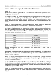 Landtag Brandenburg Drucksache 6/6683 müssen die Täter, wenn möglich, ihr Graffiti wieder selbst abreinigen. Frage 11: Nach welchen Kriterien wird Graffiti an Autobahnbrücken in Brandenburg entfernt bezie- hungsweise nicht entfernt? zu Frage 11: Graffitis, die in den Tatbestand der Volksverhetzung (§130 StGB) einzuord- nen sind, und bei Verstößen gegen den Schutz des öffentlichen Friedens und der Men- schenwürde werden entfernt bzw. übermalt. Das sind in der Regel rassistische und sexis- tische Bemalungen sowie Graffitis, die eine Verletzungen des Persönlichkeitsrechtes dar- stellen. Frage 12: Welche Kosten sind in den vergangenen fünf Jahren jeweils pro Jahr für die Entfernung von Graffiti an Autobahnbrücken in Brandenburg entstanden? zu Frage 12: Die Beseitigung von Graffiti erfolgt in Eigen- bzw. Fremdleistung. Zur Ermitt- lung der Fremdleistungskosten ist eine sehr umfängliche personelle sowie manuelle Re- cherchearbeit in den einzelnen betroffenen Autobahnmeistereien notwendig und kann in der Kürze der Zeit nicht erbracht werden. Jahr Kosten 2016 24.597,23 Euro 2015 82.104,06 Euro 2014 45.661,83 Euro 2013 25.040,61 Euro 2012 23.694,17 Euro Kosten Eigenleistung LS zur Entfernung von Bemalungen (Quelle SAP - V01S7xxx.A.4.19) Ein weiterer Kostenfaktor neben der eigentlichen Leistung (Beseitigung von Graffiti) ist im Bereich der Autobahnen auch die Verkehrssicherung. Die Kosten hierfür werden aus dem Bundeshaushalt beglichen. Frage 13: Wer ist für die Entfernung von Graffiti an Autobahnbrücken zuständig, wer trägt die Kosten? Welche gesetzlichen oder sonstigen Vorschriften regeln die Entfernung von Graffitis an Autobahnbrücken? zu Frage 13: Der Landesbetrieb Straßenwesen Brandenburg ist als Straßenbaulastträger für die Entfernung von Graffiti an Autobahnbrücken zuständig (hier speziell die Autobahn- meistereien). Es gibt keine gesetzlichen und sonstigen technischen Vorschriften, welche die Beseitigung von Graffitis regeln. Frage 14: Werden Belohnungen für Hinweise gezahlt, die zur Ergreifung oder Identifizie- rung von Personen führen, die Graffiti an Autobahnbrücken in Brandenburg angebracht haben? -4-