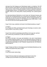 ziehungen durch die Verlagerung von Baulichkeiten wieder zu ermöglichen. Die LHP hätte eine ähnlich große Fläche für die Zwecke des Strandbades dauerhaft zur Ver- fügung, könnte in einem Neubau alle benötigten Funktionen zeitgemäß unterbringen und gegenseitige Leitungs- und Wegerechte sowie Zuwegungen wären einfacher zu gestalten. Bisher ist der Vollzug dieser Einigung allerdings nicht zustande gekom- men. Für diese beschriebenen Maßnahmen, die die Kosten der Teilungsvermessung, des Vollzugs des Grundstückstausches, der Versetzung der Einfriedungen, der Abriss- kosten des vom Sportclub genutzten Gebäudes, Teile der Auslagerungskosten und der Wiederherstellung des Drive im Park Babelsberg waren 2009 Kosten in Höhe von rund 347.000 € für die SPSG geschätzt worden. Frage 5: Wer ist dazu verpflichtet, die Kosten für die Wiederherstellung zu tragen? zu Frage 5: Es ist Aufgabe der SPSG, die Wiederherstellung der Parkanlage umzusetzen, daher sind die Kosten von der SPSG zu tragen. Frage 6: Wann sieht die Landesregierung die Stiftung in der Lage, den ursprüngli- chen Zustand des Grundstückes am Tiefen See wiederherzustellen? zu Frage 6: Die SPSG ist erst dann in der Lage, das Grundstück in der unter 4. beschriebenen Art und Weise wiederherzustellen, wenn die Grundstücksarrondierung vollzogen ist. Erst nach einer diesbezüglichen Einigung mit der LHP und der Beendigung des Nut- zungsüberlassungsvertrages mit dem Potsdamer Seesportclub kann die Wiederher- stellung beginnen. Frage 7: Werden die Pläne zur Teilverlagerung des Strandbades Babelsberg auf das Gelände des Seesportclubs weiter verfolgt? zu Frage 7: Ja, die Pläne werden weiterverfolgt. Frage 8: Wie hoch schätzt die Landesregierung die Kosten für eine (Teil- )Verlagerung des Strandbades auf das Gelände des Seesportclubs?