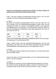 Landtag Brandenburg Drucksache 6/1329 6. Wahlperiode Antwort der Landesregierung auf die Kleine Anfrage 504 des Abgeordneten Steffen Königer und Thomas Jung der AfD-Fraktion Drucksache 6/1091 Steuergelder für vollziehbar ausreisepflichtige Personen Wortlaut der Kleinen Anfrage 504 vom 10.04.2015: In der Antwort der Landesregierung auf die Kleine Anfrage 173 in der Drucksache 6/563 wurden für die Jahre 2011-2014 folgende Zahlen ausreisepflichtiger Personen genannt: 2011 2.100 2012 2.230 2013 2.492 2014 3.136 Wir fragen die Landesregierung: 1. Wie viele vollziehbar ausreisepflichtige Personen haben in 2011 bis 2014 Leistun- gen nach dem Asylbewerberleistungsgesetz erhalten? 2. Welche Kosten nach dem Asylbewerberleistungsgesetz sind dem Land Branden- burg in den Jahren 2011 bis 2014 dadurch entstanden, dass die vollziehbar Aus- reisepflichtigen nicht ausgereist sind bzw. nicht abgeschoben wurden? 3. Wie haben sich die Gesamtausgaben nach dem Asylbewerberleistungsgesetz 2011 bis 2014 entwickelt? 4. Wie hoch ist die Gesamtanzahl der Asylbewerber, Personen mit zuerkannter Flüchtlingseigenschaft, Personen mit subsidiärem Schutz sowie abgelehnte Asyl- bewerber, die auf einen Sachbearbeiter aller mit der Betreuung und Bearbeitung des Themas betrauten Behörden in den Jahren 2011-2014 entfielen? 5. Welche Maßnahmen wird die Landesregierung ergreifen, um zukünftig den Asyl- missbrauch zu verhindern, die Unterbringungssituation zu entschärfen und den Steuerzahler nicht weiterhin entgegen gesetzlicher Grundlagen zu belasten?