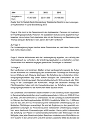 Jahr 2011 2012 2013 Ausgaben in 17.907.000 22.611.000 34.196.000 Euro Quelle: Amt für Statistik Berlin-Brandenburg, Statistischer Bericht zu den Leistungen an Asylbewerber im Land Brandenburg 2013 Frage 4: Wie hoch ist die Gesamtanzahl der Asylbewerber, Personen mit zuerkann- ter Flüchtlingseigenschaft, Personen mit subsidiärem Schutz sowie abgelehnte Asyl- bewerber, die auf einen Sach-bearbeiter aller mit der Betreuung und Bearbeitung des Themas betrauten Behörden in den Jahren 2011-2014 entfielen? Zu Frage 4: Der Landesregierung liegen hierüber keine Erkenntnisse vor, weil diese Daten statis- tisch nicht erfasst werden. Frage 5: Welche Maßnahmen wird die Landesregierung ergreifen, um zukünftig den Asylmissbrauch zu verhindern, die Unterbringungssituation zu entschärfen und den Steuerzahler nicht weiterhin entgegen gesetzlicher Grundlagen zu belasten? Zu Frage 5: Den Landkreisen und kreisfreien Städten ist laut Landesaufnahmegesetz die Aufga- be der Aufnahme und Unterbringung der ausländischen Flüchtlinge als Pflichtaufga- be zur Erfüllung nach Weisung übertragen. Die Schaffung der erforderlichen Unter- bringungsmöglichkeiten liegt daher sowohl bezüglich der Standortwahl als auch Auswahl der Unterbringungsart (Gemeinschaftsunterkunft, Wohnverbund oder Woh- nung) in der Zuständigkeit der Kommunen. Infolge des deutlichen Anstiegs der Flüchtlingszahlen haben sich die Herausforderungen zur Schaffung weiterer Unter- bringungsmöglichkeiten für die Kommunen weiter spürbar erhöht. Die Landkreise und kreisfreien Städte erhalten für die Schaffung neuer Kapazitäten in Gemeinschaftsunterkünften eine Investitionspauschale in Höhe von 2.300,81 Euro pro Platz. Um die Kommunen zu unterstützen, hat der Landtag als Sofortmaßnahme im Rahmen des Nachtragshaushaltes 2013/2014 zusätzliche Mittel i.H.v. 5 Millionen Euro für das Jahr 2014 zur Finanzierung einer verbesserten Unterbringung von aus- ländischen Flüchtlingen veranschlagt. Sie sind als Ergänzung zu den gesetzlich vor- gesehenen Leistungen zur Finanzierung einer verbesserten Unterbringung vorgese- hen, wenn bestimmte Voraussetzungen erfüllt werden. Hierzu gehört insbesondere die Schaffung von Plätzen in Gemeinschaftsunterkünften oder Wohnungen mit der Maßgabe, dass jeder Bewohnerin/jedem Bewohner mindestens eine Wohnfläche von 8 m² zusteht. In den Jahren 2015 und 2016 werden zusätzliche Mittel des Bundes bei