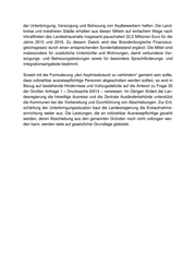 der Unterbringung, Versorgung und Betreuung von Asylbewerbern helfen. Die Land- kreise und kreisfreien Städte erhalten aus diesen Mitteln auf einfachem Wege nach Inkrafttreten des Landeshaushalts insgesamt pauschaliert 22,5 Millionen Euro für die Jahre 2015 und 2016. Zu diesem Zweck wird das Brandenburgische Finanzaus- gleichsgesetz durch einen entsprechenden Sondertatbestand ergänzt. Die Mittel sind insbesondere für zusätzliche Unterkünfte und Wohnungen, damit verbundene Ver- sorgungs- und Betreuungsleistungen sowie für besondere Sprachförderungs- und Integrationsangebote bestimmt. Soweit mit der Formulierung „den Asylmissbrauch zu verhindern“ gemeint sein sollte, dass vollziehbar ausreisepflichtige Personen abgeschoben werden sollten, so wird in Bezug auf bestehende Hindernisse und Vollzugsdefizite auf die Antwort zu Frage 30 der Großen Anfrage 1 – Drucksache 6/614 – verwiesen. Im Übrigen fördert die Lan- desregierung die freiwillige Ausreise und die Zentrale Ausländerbehörde unterstützt die Kommunen bei der Vorbereitung und Durchführung von Abschiebungen. Zur Ent- schärfung der Unterbringungssituation baut die Landesregierung die Erstaufnahme- einrichtung weiter aus. Die Leistungen, die an vollziehbar Ausreisepflichtige gezahlt werden, deren Abschiebung aus den genannten Gründen noch nicht vollzogen wer- den kann, werden stets auf gesetzlicher Grundlage geleistet.