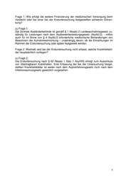 Landtag Brandenburg Drucksache 6/1142 6. Wahlperiode Antwort der Landesregierungauf die Kleine Anfrage 433 der Abgeordneten Roswitha Schier der CDU-Fraktion Drucksache 6/933 Nachfrage zur Kleinen Anfrage 297 - Gesundheitsämter Wortlaut der Kleinen Anfrage 433 vom 23.03.2015: In der Antwort auf die Kleine Anfrage 297 führt die Landesregierung aus, dass das Land ab dem 1.7.2015 dem die Erstuntersuchung durchführenden Landkreis pro Un- tersuchung 138 Euro pauschal erstattet. Weiterhin heißt es, dass der Landesregierung nicht bekannt ist, welche Krankheits- bilder bislang am häufigsten festgestellt wurden, obwohl derzeit nur der Landkreis Oder-Spree für die Erstuntersuchung verantwortlich ist. Ich frage die Landesregierung: 1. Wie erfolgt die weitere Finanzierung der medizinischen Versorgung beim Ver- dacht oder bei einer bei der Erstuntersuchung festgestellten schweren Erkran- kung? 2. Weshalb wird bei der Erstuntersuchung nicht erfasst, welche Krankheitsbilder hauptsächlich vorliegen? Namens der Landesregierung beantwortet die Ministerin für Arbeit, Soziales, Ge- sundheit, Frauen und Familie die Kleine Anfrage wie folgt: Vorbemerkung: Das Land erstattet für Gesundheitsuntersuchungen bereits derzeit pauschal pro Un- tersuchung 138 Euro nach § 2 der Zuständigkeitsverordnung nach dem Asylverfah- rensgesetz für Gesundheitsuntersuchungen (ZVAsylVfG). Ab dem 01.07.2015 wird die Zuständigkeit zur Durchführung von Erstuntersuchungen nach § 62 Asylverfahrensgesetz (AsylVfG) neu geregelt. Datum des Eingangs: 15.04.2015 / Ausgegeben: 20.04.2015