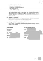 the General Conditions (Annex D); the Terms of Reference (Annex D) Organisation & Methodology (Annex II); The Budget (Annex V); LEF and BAF (Annex VD The various documents making up the contract shall be deemed to be mutually explanatory; in cases of ambiguity or divergence, they shall prevail in the order in which they appear above. Addenda shall have the order of precedence of the document they are amending. (4) Language of the contract The language of the contract and of all written communications between the Contractor and the Contracting Authority and/or the Project Manager shall be English. (5) Other specific conditions applying to the Contract Done in English in two originals, one original for the European Commission, and one original for the Contractor. For the Contractor For the Contracting Authori Name: Michael Name: Spindelegger Title: Director General Signature: Date: