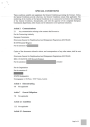 SPECIAL CONDITIONS These conditions amplify and supplement the General Conditions governing the Contract. Unless the Special Conditions provide otherwise, the General Conditions remain fully applicable. The numbering of the Articles of the Special Conditions is not consecutive but follows the numbering of the General Conditions. Exceptionally, and with the approval of the competent European Commission departments, other clauses can be indicated to cover particular situations. Artide2 Communications 2 Any communication relating to the contract shall be sent to: For the Contracting Authority European Commission Directorate-General for Neighbourhood and Enlargement Negotiations (DG NEAR) B-1049 Brussels/ Belgium For the attention of Pen] Copies of the documents referred to above, and correspondence of any other nature, shall be sent to: Directorate-General for Neighbourhood and Enlargement Negotiations (DG NEAR) BRU-J-54 04/225 B-1049 Brussels/ Belgium For the attention o window For the Organisation For the attention of: ICMPD Headquarters Gonzagagasse 1, 5th floor, 1010 Vienna, Austria Article 4_ Subcontracting 4.9 Not applicable Article7 General Obligations 7.8 Not applicable Article 12 - Liabilities 12.2 Not applicable Article 13 - Insurance Page 3 0f5