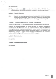 29.3 Not applicable 29.5 Payments shall be made in euro in accordance with Articles 20.6 and 29.4 of the General Conditions into the bank account notified by the Contractor to the Contracting Authority. Article 30 Financial Guarantee 30.1 When the pre-financing requested is equal or below EUR 300 000 and subject to a positive risk assessment by the Contracting Authority, by derogation from article 30 of the General Conditions no pre-financing guarantee is required. Article 40 Settlement of disputes and Article 41 Applicable law Articles 40.3, 40.4 and 41.1 of the General Conditions shall be replaced by the following: In default of amicable settlement, the parties may refer the matter to arbitration in accordance with the Permanent Court of Arbitration Optional Rules for Arbitration Involving International Organisations and States in force at the date of conclusion of this Agreement. The appointing authority shall be the Secretary General of the Permanent Court of Arbitration following a written request submitted by either Party. The Arbitrator’s decision shall be binding on all Parties and there shall be no appeal. Article 42 Data Protection Not applicable Article 43 Further additional clauses Not applicable Page 5 of5 u