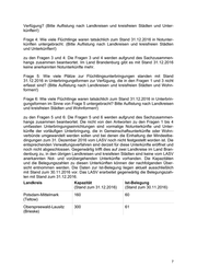 GU Stahnsdorf 137 86 GU Teltow 250 172 GU Teltow 266 110 GU Teltow 150 0 ÜW Bad Belzig 179 171 Prignitz WV Perleberg 985 508 WV Plattenburg 195 71 WV Pritzwalk 496 174 GU Wittenberge 22 0 GU Wittenberge 28 1 Spree-Neiße GU Forst 160 91 WV Forst 90 43 GU Forst 160 0 GU Guben 110 82 GU Spremberg 120 0 ÜW Forst 1.177 680 Teltow-Fläming WV Mellensee 60 30 GU Blankenfelde-Mahlow 500 173 GU Blankenfelde-Mahlow 92 9 GU Großbeeren 162 54 GU Jüterbog 50 18 GU Jüterbog 125 92 GU Luckenwalde 102 0 GU Luckenwalde 80 70 GU Luckenwalde 145 26 GU Luckenwalde 115 66 GU Ludwigsfelde 293 98 GU Ludwigsfelde 66 46 WV Niedergörsdorf 60 27 GU Nuthe-Urstromtal 155 57 GU Rangsdorf 60 32 GU Rangsdorf 70 41 GU Trebbin 102 38 ÜW Luckenwalde 163 163 Uckermark GU Angermünde 35 0 GU Angermünde 72 48 GU Lychen 105 68 GU Prenzlau 520 301 GU Prenzlau 80 2 WV Schwedt 124 113 GU Templin 170 101 GU Templin 50 29 ÜW Prenzlau 419 419 Frage 3: Wie viele Plätze zur Flüchtlingsunterbringung standen mit Stand 31.12.2016 in welchen Notunterkünften in den einzelnen Landkreisen und kreisfreien Städten zur