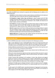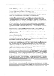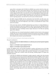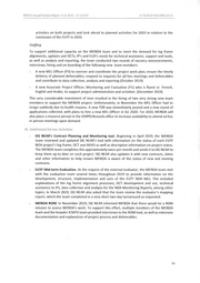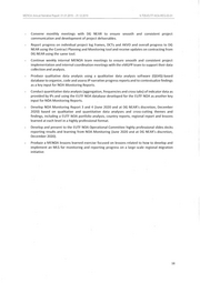 MENOA Annual Narrative Report: 01.01.2019 — 31.12.2019 N T05-EUTF-NOA-REG-03-01 Convene monthly meetings with DG NEAR to ensure smooth and consistent project communication and development of project deliverables. Report progress on individual project log frames, DCTs and AKVO and overall progress to DG NEAR using the Contract Planning and Monitoring tool and receive updates on contracting from DG NEAR using the same tool. Continue weekly internal MENOA team meetings to ensure smooth and consistent project implementation and internal coordination meetings with the eMGPP team to support their data collection and analysis. Produce qualitative data analysis using a qualitative data analysis software (QDAS)-based database to organize, code and assess IP narrative progress reports and to contextualize findings as a key input for NOA Monitoring Reports. Conduct quantitative data analysis (aggregation, frequencies and cross tabs) of indicator data as provided by IPs and using the EUTF NOA database developed for the EUTF NOA as another key input for NOA Monitoring Reports. Develop NOA Monitoring Report 3 and 4 (June 2020 and at DG NEAR’s discretion, December 2020) based on qualitative and quantitative data analyses and cross-cutting themes and findings, including a EUTF NOA portfolio analysis, country reports, regional report and lessons learned at each level in a highly professional format. Develop and present to the EUTF NOA Operational Committee highly professional slides decks reporting results and learning from NOA Monitoring (June 2020 and at DG NEAR’s discretion, December 2020). Produce a MENOA lessons learned exercise focused on lessons related to how to develop and implement an MLS for monitoring and reporting progress on a large-scale regional migration initiative. 18