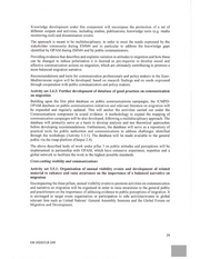Knowledge development under this component will encompass the production of a set of different outputs and activities, including studies, publications, knowledge tools (e.g. media monitoring tool) and dissemination events. The approach is meant to be multidisciplinary, in order to mect the needs expressed by the stakeholder community during EMM4 and in particular to address the knowledge gaps identified by OPAM during EMMA and by public communicators. Providing evidence that describes and explains variation in attitudes to migration and how these can be changed to reduce polarisation it is deemed as pre-requisite to develop sound and effective communication actions on migration, which are ultimately contributing to promote a more balanced migration narrative. Recommendations and tools for communication professionals and policy makers in the Euro- Mediterranean region will be developed, based on research findings and on needs expressed through cooperation with public communicators and policy makers. Activity set 3.4.2: Further development of database of good practices on communication on migration Building upon the first pilot database on public communications campaigns, the ICMPD- OPAM database on public communication initiatives and relevant literature on migration will be expanded and regularly updated. This will anchor the activities carried out under the Communications component in sound evidence. A methodology to expand the mapping of communication campaigns will be also developed, following a multidisciplinary approach. The database will primarily serve as a basis to develop analysis and test theoretical approaches before developing recommendations. Furthermore, the database will serve as a repository of practical tools for public authorities and communications to address challenges identified through the workshops (Activity 3.3.1). The database will be made available to the general public via the imap platform (Output 2.4). The above described body of work under pillar 3 on public attitudes and perceptions will be implemented in partnership with OPAM, which have extensive experience, expertise and a global network to facilitate the work to the highest possible standards. Cross-cutting visibility and communications Activity set 3.5.1: Organisation of annual visibility events and development of related material to enhance and raise awareness on the importance of a balanced narrative on migration Encompassing the three pillars, annual visibility events to promote activities on communication and narrative on migration will be organised in order to raise awareness to the general public and practitioners on the importance of adducing evidence to public perceptions of migration. It is envisaged to target event organisation or participation to side activities/events in global relevant fora such as United Nations’ Gencral Assembly Sessions and the Global Forum on Migration and Development. 29 ENI 2020/218-249