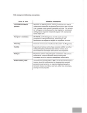 Risk management informing assumptions Sector or Area Governmentalofficial partners European Commission Financing Stability Dialogue Media and the public Informing Assumptions SPCs and EU MS Programme partner governments and official stakeholders demonstrate the necessary political will and sufficient trust to engage in and support Programme activities. This includes the willingness to introduce and/or adapt legislative, institutional and regulatory migration frameworks aligned with international human rights laws. DG NEAR and EU Delegations provide expert input and perspectives on Programme design, methodologies and deliverables, and engage and support all Programme activities. Financial resources are available and allocated to the Programme. Regional and national political and economic stability as well as stable participating institutions and entities, working in an environment that encourages participation and cooperation. Programme partners and participants committed to and active in coordination, communication and dialogue through the Programme as well as migration management more broadly. The media and general public in SPCs and the EU MS are open to learning about and, where needed, to changing their recurrent perspectives and narratives on migration/migrants through an incrcased reliance on evidence and facts, rather than stereotypes, assumptions and prejudice.