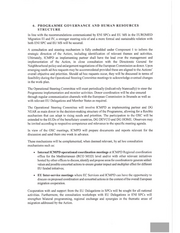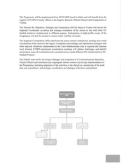 6. PROGRAMME GOVERNANCE AND HUMAN RESOURCES STRUCTURE In line with the recommendations communicated by ENI SPCs and EU MS in the EUROMED Migration III and IV, a stronger steering role of and a more formal and sustainable relation with both ENI SPC and EU MS will be secured. A consultation and steering mechanism is fully embedded under Component 1 to inform the strategic direction of the Action, including identification of relevant themes and activities. Ultimately, ICMPD as implementing partner shall have the lead over the management and implementation of the Action, in close consultation with the Directorate General for Neighbourhood policy and enlargement negotiations ofthe European Commission as donor. Upon emerging needs ad-hoc requests may be accommodated provided these are aligned to the Actions’ overall objective and priorities. Should ad hoc requests occur, they will be discussed in terms of feasibility during the Operational Steering Committee meetings to acknowledge eventual changes in the work-plan. The Operational Steering Committee will meet periodically (indicatively biannually) to steer the Programme implementation and monitor activities. Donor coordination will be also ensured through regular communication channels with the European Commission in Brussels as well as with relevant EU Delegations and Member States as required. The Operational Steering Committee will involve ICMPD as implementing partner and DG NEAR as main donor in the decision-making structure of the Programme, allowing for a flexible mechanism that can adapt to rising needs and priorities. The participation to the OSC will be extended to the EUDs ofthe beneficiary countries, DG DEVCO and DG HOME. Observers may be invited according to respective competence and relevance to the specific meeting agenda. In view of the OSC meetings, ICMPD will prepare documents and reports relevant for the discussion and send them one week in advance. These mechanisms will be complemented, when deemed relevant, by ad hoc consultation mechanisms such as: « Internal ICMPD operational coordination meetings at ICMPD Regional coordination office for the Mediterranean (RCO MED) level and/or with other relevant initiatives hosted by other offices to discuss, identify and propose areas for coordination to generate added- values and possible concerted actions to ensure greater impact and multiplier effect for different EU funded initiatives; e EU Inter-service meetings where EC Services and ICMPD can have the opportunity to discuss on proposed coordination and concerted actions in the context ofthe overall European migration cooperation. Cooperation with and support from the EU Delegations in SPCs will be sought for all national activities. Furthermore, the consultation workshops with EU Delegations in ENI SPCs will strengthen bilateral programming, regional exchange and synergies in the thematic areas of migration addressed by the Action.