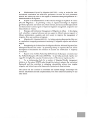 . Mediterranean City-to-City Migration (MC2CM) — acting as a relay for inter- institutional coordination and multi-level governance vis-A-vis the local government network and joining up action in the support of awareness raising and promotion of a balanced narrative on migration . Support to the Implementation of the National Strategy on Migration of Tunisia (ProGreS Migration) — by providing a relay on regional knowledge on migration governance processes and lessons and, where relevant, provide successful regional tools and mechanisms to enhance goals of improved migration management, cooperation and data collection in Tunisia . Strategic and Institutional Management of Migration in Libya — by developing tools which have a regional relevance and can support in efforts to enhance capacity of Libyan administration, academia and civil society to improve the management of migration flows and conditions of migrants . Migration EU eXpertise (MIEUX) - by further exploring the potential of this tool as amechanism to support governments in accessing EU migration expertise and technical support . Strengthening the Evidence Base for Migration Policies: A Central Migration Data Management Solution for Jordan — by promoting sharing of experience that can lead to development of mechanisms for collection of accurate and reliable data on migratory movements . Support to the Mobility Partnership (MP) between the European Union (EU) and the Hashemite Kingdom Of Jordan (JEMPAS) — by providing technical expertise and support to strengthen the capacity of implementation of the national migration policy . As an implementing body for a number of Integrated Border Management initiatives in the region, ICMPD seeks through this Action to enhance the institutional framework and thus contribute to mitigating vulnerabilities arising from irregular migration and further improve the framework of protection in these territories. The Action will also continue to consolidate and expand strategic partnerships with relevant stakeholders and seek complementarity with other initiatives funded by EU and other donors.
