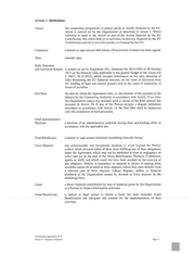 Article 1: Definitions Action: Contractor: Days: Early Detection and Exclusion System! End Date: Final Administrative Decision: Final Beneficiary: Force Majeure: Grant: Grant Beneficiary: Contribution Agreement 2018 Annex II - General Conditions the cooperation programme or project partly or wholly financed by the EU, which is carried out by the Organisation as described in Annex I. Where reference is made to the Action or part of the Action financed by the EU Contribution, this refers both (i) to activities exclusively financed by the EU Contribution and (ii) to activities jointly co-financed by the EU. a natural or legal person with whom a Procurement Contract has been signed. calendar days. a system set up by Regulation (EU, Euratom) No 2015/1929 of 28 October 2015 on the financial rules applicable to the general budget of the Union (OJ L 286/1, 30.10.2015), which includes information on the early detection of risks threatening the EU financial interests, on the cases of exclusion from EU funding of legal and natural persons and on the cases of imposition of financial penalties. the date by which the Agreement ends, i.e. the moment of the payment of the balance by the Contracting Authority in accordance with Article 19 or when the Organisation repays any amounts paid in excess of the final amount due pursuant to Article 20. If any of the Parties invokes a dispute settlement procedure in accordance with Article 14, the End Date shall be postponed until the completion of such procedure. a decision of an administrative authority having final and binding effect in accordance with the applicable law. a natural or legal person ultimately benefitting from the Action. any unforeseeable and exceptional situation or event beyond the Parties’ control which prevents either of them from fulfilling any of their obligations under the Agreement, which may not be attributed to error or negligence on either part (or on the part of the Grant Beneficiaries, Partners, Contractors, agents or staff), and which could not have been avoided by the exercise of due diligence. Defects in equipment or material or delays in making them available cannot be invoked as force majeure, unless they stem directly from a relevant case of force majeure. Labour disputes, strikes or financial problems of the Organisation cannot bc invoked as force majcurc by the defaulting Party. a direct financial contribution by way of donation given by the Organisation or a Partner to finance third parties activities. a natural or legal person to whom a Grant has been awarded. Grant Beneficiaries can sub-grant and procure for the implementation of their activities. Page 2