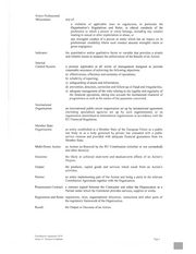 Grave Professional Misconduct: Indicator: Internal Control System: International Organisation: Member State Organisation: Multi-Donor Action: Outcome: Output: Partner: Procurement Contract: Regulations and Rules: Result: Contribution Agreement 2018 Annex IT - General Conditions any of: a violation of applicable laws or regulations, in particular the Organisation’s Regulations and Rules, or ethical standards of the profession to which a person or entity belongs, including any conduct leading to sexual or other exploitation or abuse, or any wrongful conduct of a person or entity which has an impact on its professional credibility where such conduct denotes wrongful intent or gross negligence. the quantitative and/or qualitative factor or variable that provides a simple and reliable means to measure the achievement of the Results of an Action. a process applicable at all levels of management designed to provide reasonable assurance of achieving the following objectives: a) effectiveness, efficiency and economy of operations; b) reliability of reporting; c) safeguarding of assets and information; d) prevention, detection, correction and follow-up of fraud and irregularities; e) adequate management of the risks relating to the legality and regularity of the financial operations, taking into account the multiannual character of programmes as well as the nature of the payments concerned. an international public-sector organisation set up by international agreement (including specialised agencies set up by such organisations), or an organisation assimilated to international organisations in accordance with the EU Financial Regulation. an entity established in a Member State of the European Union as a public law body or as a body governed by private law entrusted with a public service mission and provided with adequate financial guarantees from the Member State. an Action co-financed by the EU Contribution (whether or not carmarked) and other donor(s). the likely or achieved short-term and medium-term effects of an Action’s Outputs. the products, capital goods and services which result from an Action’s activities. an entity implementing part of the Action and being a party to the relevant Contribution Agreement together with the Organisation. a contract signed between the Contractor and either the Organisation or a Partner under which the Contractor provides services, supplies or works. regulations, rules, organisational directives, instructions and other parts of the regulatory framework of the Organisation. the Output or Outcome of an Action. Page 3