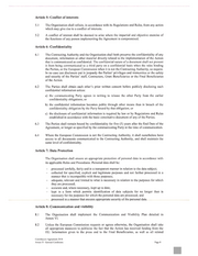 Article 5: Conflict of interests 5.1 52 The Organisation shall refrain, in accordance with its Regulations and Rules, from any action which may give rise to a conflict of interests. A conflict of interest shall be deemed to arıse where the impartial and objective exercise of the functions of any person implementing the Agreement is compromised. Article 6: Confidentiality 6.1 6.2 6.3 6.4 The Contracting Authority and the Organisation shall both preserve the confidentiality of any document, information or other material directly related to the implementation of the Action that is communicated as confidential. The confidential nature of a document shall not prevent it from being communicated to a third party on a confidential basis when the rules binding the Parties, or the European Commission when it is not the Contracting Authority, so require. In no case can disclosure put in jeopardy the Parties’ privileges and immunities or the safety and security of the Parties’ staff, Contractors, Grant Beneficiaries or the Final Beneficiaries ofthe Action. The Parties shall obtain each other’s prior written consent before publicly disclosing such confidential information unless: a) the communicating Party agrees in writing to release the other Party from the carlier confidentiality obligations; or b) the confidential information becomes public through other means than in breach of the confidentiality obligation by (he Party bound by that obligalion; or c) the disclosure of confidential information is required by law or by Regulations and Rules established in accordance with the basic constitutive document of any of the Parties. The Parties shall remain bound by confidentiality for five (5) years after the End Date of the Agreement, or longer as specified by the communicating Party at the time of communication. Where the European Commission is not the Contracting Authority, it shall nonetheless have access to all documents communicated to the Contracting Authority, and shall maintain the same level of confidentiality. Article 7: Data Protection The Organisation shall ensure an appropriate protection of personal data in accordance with its applicable Rules and Procedures. Personal data shall be: — processed lawfully, fairly and in a transparent manner in relation to the data subject; — collected for specified, explicit and legitimate purposes and not further processed in a manncr that is incompatible with thosc purposes; — adequate, relevant and limited to what is necessary in relation to the purposes for which they are processed; — accurate and, where necessary, kept up to date; — kept in a form which permits identification of data subjects for no longer than is necessary for the purposes for which the personal data are processed; and — processed in a manner that ensures appropriate security of the personal data. Article 8: Communication and visibility 8.1 8.2 The Organisation shall implement the Communication and Visibility Plan detailed in Annex VI. Unless the European Commission requests or agrees otherwise, the Organisation shall take all appropriate measures to publicise the fact that the Action has received funding from the EU. Information given to the press and to the Final Beneficiaries, as well as all related Contribulion Agreement 2018 Annex II - General Conditions Page 8