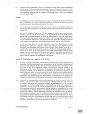 92 Where the results mentioned in Article 9.1 include pre-existing rights and the Organisation cannot warrant the Contracting Authority (and the European Commission where it is not the Contracting Authority) the right to use such results, the Organisation shall inform in writing the Contracting Authority (and the European Commission, where it is not the Contracting Authority) accordingly. Transfer 9.3 9.4 9.5 9.6 The equipment, vehicles and remaining major supplies purchased with the EU Contribution shall be transferred to or remain with local authorities, local Grant Beneficiaries or Final Beneficiaries, at the latest when submitting the final report. The documentary proof of those transfers shall not be presented with the final reports, but shall be kept for verification for the duration and along with the documents mentioned in Article 16.2. By way of derogation from Article 9.3, the equipment, vehicles and remaining major supplies purchased with the EU Contribution in the framework of actions which continue after the end of the Implementation Period may be transferred at the end ofthe overall action. The Organisation shall use the equipment, vehicles and remaining major supplies for the benefit of the Final Beneficiaries. The Organisation shall inform the Contracting Authority on the end use ofthe equipment, vehicles and remaining major supplies in the final report. In the event that there arc no local authorities, local Grant Beneficiaries or Final Beneficiaries to whom the equipment, vehicles and remaining major supplies could be transferred, the Organisation may transfer them to another action funded by the EU or - exceptionally - retain ownership of the equipment, vehicles and remaining major supplies at the end of the Action or the overall action. In such cases, it shall submit a justified written request with an inventory listing ofthe items concerned and a proposal concerning their use in due course and - at the latest — together with the submission of the final report. In no event may the end use jeopardize the sustainability of the Action. Article 10: Monitoring and evaluation of the Action 10.1 10.2 Keeping in mind the commitment of the Parties to the effective and efficient operation of the Agreement, the Organisation shall invite representatives of the European Commission and the Contracting Authority (if other than the European Commission) to participate at their own costs to the main monitoring missions and evaluation exereises related to the performance of the Action. Participation in evaluation exercises should be ensured by requesting comments from the European Commission and the Contracting Authority on the terms of reference before the exercise takes place, and on the different deliverables related to an evaluation exercise prior to their final approval (as a minimum, on the final report). The Organisation shall send all monitoring and evaluation reports relating to the Action to the European Commission and the Contracting Authority once issued, subject to confidentiality. Article 10.1 is without prejudice to any monitoring mission or evaluation exercise, which the European Commission as a donor, or the Contracting Authority, at their own costs, may wish to perform. Monitoring and evaluation missions by representatives of the European Commission or the Contracting Authority shall be planned ahcad and completed in a collaborative manner between the staff of the Organisation and the European Commission's (or Contracting Authority’s) representatives, keeping in mind the commitment of the Parties to the effective and efficient operation of the Agreement. The European Commission (or the Contracting Authority) and the Organisation shall agree on procedural matters in advance. The European Commission (or the Contracting Authority) shall make available to the Organisation the terms of reference of the evaluation exereise before it takes place, as well as the different deliverables (as a minimum, the draft final report) for comments prior to final issuance. The European Commission (or the Contracting Authority) shall send the final monitoring and evaluation report to the Organisation once issued. Contribution Agreement 2018 Annex IT - General Conditions Page 10