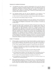 Suspension for exceptional circumstances 12.5 12.6 12.7 12.8 The Organisation may decide to suspend the implementation of all or part of the Action if exceptional or unforeseen circumstances beyond the control of the Organisation make such implementation impossible or excessively difficult, such as in cases of Force Majeure. The Organisation shall inform the Contracting Authority immediately and provide all the necessary details, including the measures taken to minimise any possible damage, and the foreseeable effect and date of resumption. The Contracting Authority may also notify the Organisation of the suspension of the implementation ofthe Agreement if exceptional circumstances so require, in particular: a) when a relevant EU Decision identifying a violation of human rights has been adopted; or b) in cascs such as crisis entailing a change of EU policy. Neither of the Parties shall be held liable for breach of its obligations under ihe Agreement if Force Majeure or exceptional circumstances as set forth under Articles 12.5 and 12.6 prevent it from fulfilling said obligations, and provided it takes any measures to minimise any possible damage. In the situations listed in Articles 12.5 and 12.6, the Parties shall minimise the duration of the suspension and shall resume implementation once the conditions allow. During the suspension period, the Organisation shall be entitled to the reimbursement of the minimum costs, including new legal commitments, necessary for a possible resumption of the implementation of the Agreement or of the Action. The Parties shall agree on such costs, including the reimbursement of legal commitments entered into for implementing the Action before the notification of the suspension was received which the Organisation cannot reasonably suspend, reallocate or terminate on legal grounds. This is without prejudice to any amendments to the Agreement that may be necessary to adapt the Action to the new implementing conditions, including, if possible, the extension of the Implementation Period or to the termination ofthe Agreement in accordance with Article 13.3. In case of suspension due to Force Majeure or ifthe Action is a Multi-Donor Action, the Implementation Period is automatically extended by an amount of time equivalent to the duration of the suspension. Article 13: Termination 13.1 13.2 Without prejudice to any other provision ofthese General Conditions or penalties foreseen in the EU Financial Regulation, where applicable, and with due regard to the principle of proportionality, the Contracting Authority may terminate the Agreement ifthe Organisation: a) fails to fulfil a substantial obligation incumbent on it under the terms of the Agreement; b) is guilty of misrepresentation or submits false or incomplete statements to obtain the EU Contribution or provides reports that do not reflect reality to obtain or keep the EU Contribution without cause; c) is bankrupt or being wound up, or is subject to any other similar proceedings; d) is guilty of Grave Professional Misconduct proven by any justified means; e) has committed fraud, corruption or any other illegal activity to the detriment of the EU’s financial interests on the basis of proof in the possession of the Contracting Authority; f) fails to comply with the reporting obligations in accordance with Article 3.15; g) has committed any of the failings described in Article 12.3 on the basis of proof in the possession of the Contracting Authority. Before terminating the Agreement in accordance with Article 13.1, the Contracting Authority shall formally notify the Organisation of its intention to terminate, inviting the Organisation to make observations (including proposals for remedial measures) within thirty (30) days from the receipt of the notification. During this period, and until the termination takes effect, Contribution Agreement 2018 Annex II - General Conditions Page 13