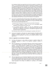 13.3 13.4 the Contracting Authority may suspend the time limit for any payment in accordance with Article 12.2 as a precautionary measure informing the Organisation immediately in writing. If the Organisation does not submit observations, or if, after examination of the observations submitted by the Organisation, the Contracting Authority decides to pursue the termination, the Contracting Authority may terminate the Agreement serving seven (7) days’ prior notice. During that period, the Organisation may refer the matter to the responsible director in the European Commission. Where the Contracting Authority is the European Commission, the termination will take effect if and when confirmed by the director. Where the Contracting Authority is not the European Commission, the referral to the responsible director in the European Commission will not suspend the effects of the decision of the Contracting Authority. In case of termination, the Contracting Authority may demand full repayment of any amounts paid in excess of the final amount determined in accordance with Article 20 after allowing the Organisation to submit its observations. Neither Party shall be entitled to claim indemnity by the other Party on account of the termination of this Agreement. If, at any time, either Party believes that the purpose of the Agreement can no longer be effectively or appropriately performed, it shall consult the other Party. Failing agreement on a solution, either Party may terminate the Agreement by serving sixty (60) days written notice. In this case, the final amount shall cover: a) payment only for the part ofthe Action carried out up to the date of termination; b) in the situations described in Articles 12.5 and 12.6, the unavoidable residual expenditures incurred during the notice period; and, c) in the situations described in Articles 12.5 and 12.6, reimbursement of legal commitments the Organisation entered into for implementing the Action before the written notice on termination was received by it and which the Organisation cannot reasonably terminate on legal grounds. The Contracting Authority shall recover the remaining part in accordance with Article 15. In the event of termination, a final report and a request for payment of the balance shall be submitted in accordance with Articles 3 and 19. The Contracting Authority shall not reimburse or cover any expenditure or costs which are not included or justified in a report approved by it. Article 14: Applicable law and settlement of disputes 14.1 14.2 14.3 The Parties shall endeavour to settle amicably any disputes or complaints relating to the interpretation, application or validity of the Agreement, including its existence or termination. Where the Organisation is not an International Organisation, and the European Commission is the Contracting Authority, this Agreement is governed by EU law, complemented - if necessary - by the relevant provisions of Belgian law. In the absence of an amicable settlement in accordance with Article 14.1 above, the General Court, or on appeal the Court of Justice of the European Union, has sole jurisdietion. Such actions must be brought under Article 272 of the Treaty on the Functioning of the EU (TFEU). Notwithstanding the foregoing sentence, where the Organisation is not established or incorporated in the EU, any of the Parties may bring before the Brussels courts any dispute between them concerning the interpretation, application or validity of the Agreement, if such dispute cannot be settled amicably. Where one party has brought proceedings before the Brussels courts, the other party may not bring a claim arising from the interpretation, application or validity of the Agreement in any other court than the Brussels courts before which the proceedings have already been brought. Where the Organisation is not an International Organisation and the European Commission is not the Contracting Authority, the Agreement shall be governed by the law of the country of the Contracting Authority and the courts of the country of the Contracting Authority shall have exclusive jurisdiction, unless otherwise agreed by the Parties. The dispute may, by common agreement of the Parties, be submitted for conciliation to the European Contribution Agreement 2018 Annex II - General Conditions Page 14