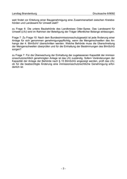 Landtag Brandenburg Drucksache 6/9092 weit findet vor Erteilung einer Baugenehmigung eine Zusammenarbeit zwischen Kreisbe- hörden und Landesamt für Umwelt statt? zu Frage 6: Die untere Baubehörde des Landkreises Oder-Spree. Das Landesamt für Umwelt (LfU) wird im Rahmen der Beteiligung der Träger öffentlicher Belange einbezogen. Frage 7: Zu Frage 10: Nach dem Bundesimmissionsschutzgesetzt ist jede Änderung einer Anlage für sich genommen genehmigungspflichtig, wenn die Mengenschwellen des An- hangs der 4. BImSchV überschritten werden. Welche Behörde muss die Überschreitung der Mengenschwellen überprüfen und für die Einhaltung der Bestimmungen des BImSchG sorgen? zu Frage 7: Für die Überwachung der Einhaltung der zugelassenen Kapazität der immissi- onsschutzrechtlich genehmigten Anlage ist das LfU zuständig. Sofern Veränderungen der Kapazität der Anlage der Behörde nach § 15 BImSchG angezeigt werden, prüft das LfU, ob für die beabsichtigte Änderung eine immissionsschutzrechtliche Genehmigung erfor- derlich ist. -3-