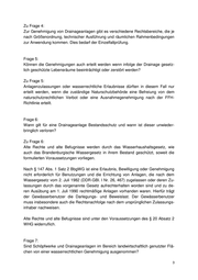 Zu Frage 4: Zur Genehmigung von Drainageanlagen gibt es verschiedene Rechtsbereiche, die je nach Größenordnung, technischer Ausführung und räumlichen Rahmenbedingungen zur Anwendung kommen. Dies bedarf der Einzelfallprüfung. Frage 5: Können die Genehmigungen auch erteilt werden wenn infolge der Drainage gesetz- lich geschützte Lebensräume beeinträchtigt oder zerstört werden? Zu Frage 5: Anlagenzulassungen oder wasserrechtliche Erlaubnisse dürften in diesem Fall nur erteilt werden, wenn die zuständige Naturschutzbehörde eine Befreiung von dem naturschutzrechtlichen Verbot oder eine Ausnahmegenehmigung nach der FFH- Richtlinie erteilt. Frage 6: Wann gilt für eine Drainageanlage Bestandsschutz und wann ist dieser unwieder- bringlich verloren? Zu Frage 6: Alte Rechte und alte Befugnisse werden durch das Wasserhaushaltsgesetz, wie auch das Brandenburgische Wassergesetz in ihrem Bestand geschützt, soweit die formulierten Voraussetzungen vorliegen. Nach § 147 Abs. 1 Satz 2 BbgWG ist eine Erlaubnis, Bewilligung oder Genehmigung nicht erforderlich für Benutzungen und die Errichtung von Anlagen, die nach dem Wassergesetz vom 2. Juli 1982 (DDR-GBl. I Nr. 26, 467) zugelassen oder deren Zu- lassungen durch das vorgenannte Gesetz aufrechterhalten worden sind und zu de- ren Ausübung am 1. Juli 1990 rechtmäßige Anlagen vorhanden waren. Hierfür trägt der Gewässerbenutzer die Darlegungs- und Beweislast. Der Gewässerbenutzer muss insbesondere auch die Rechtsnachfolge nach dem ursprünglichen Zulassungs- inhaber nachweisen. Alte Rechte und alte Befugnisse sind unter den Voraussetzungen des § 20 Absatz 2 WHG widerruflich. Frage 7: Sind Schöpfwerke und Drainageanlagen im Bereich landwirtschaftlich genutzter Flä- chen von einer wasserrechtlichen Genehmigung ausgenommen?