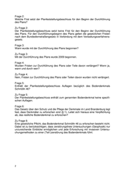 Frage 2: Welche Frist setzt der Planfeststellungsbeschluss für den Beginn der Durchführung des Plans? Zu Frage 2: Der Planfeststellungsbeschluss setzt keine Frist für den Beginn der Durchführung des Plans. Für den Durchführungsbeginn des Plans gelten die gesetzlichen Fristen nach dem Bundesfernstraßengesetz in Verbindung mit dem Verwaltungsverfahrens- gesetz. Frage 3: Wann wurde mit der Durchführung des Plans begonnen? Zu Frage 3: Mit der Durchführung des Plans wurde 2009 begonnen. Frage 4: Wurden Fristen zur Durchführung des Plans oder Teile davon verlängert? Wenn ja, wann und durch wen? Zu Frage 4: Nein, Fristen zur Durchführung des Plans oder Teilen davon wurden nicht verlängert. Frage 5: Enthält der Planfeststellungsbeschluss Auflagen bezüglich des Bodendenkmals Schmölln 46? Zu Frage 5: Der Planfeststellungsbeschluss enthält zum genannten Bodendenkmal keine spezifi- schen Auflagen. Frage 6: Das Gesetz über den Schutz und die Pflege der Denkmale im Land Brandenburg legt fest, dass Denkmäler zu erforschen sind (§ 1). Leitet sich hieraus eine Verpflichtung ab, das restliche Bodendenkmal zu erforschen? Zu Frage 6: Eine gesetzliche Pflicht, das Bodendenkmal Schmölln 46 zu erforschen besteht nicht. Dabei ist zu berücksichtigen, dass zerstörungsfreie Untersuchungen (Geophysik) nur unzureichende Einblicke ermöglichen und jede Erforschung mit invasiven Untersu- chungsmethoden zu einer (Teil-)zerstörung des Bodendenkmals führt.