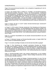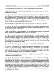 Landtag Brandenburg Drucksache 6/10455 Obergrenze wurde am Stichtag 01.12.2018 zu 68,4% in Anspruch genommen. Frage 13: Wer ist für die Unterzeichnung der Derivate-Vereinbarungen innerhalb der Lan- desregierung zuständig? zu Frage 13: Die Leitung und die Mitarbeitenden des Referats 27 „Liquiditäts- und Schul- denmanagement, Landesschuldenverwaltung, Haushalts-, Kassen- und Rechnungswe- sen, Fachaufsicht LHK, Versorgungsfonds, Kreditaufnahme und Schuldenverwaltung für Sondervermögen Finanzierungsfonds Flughafen BER“ des Ministeriums der Finanzen des Landes Brandenburg dürfen gemäß Dienstanweisung und unter Berücksichtigung des 4- Augen-Prinzips Derivate-Vereinbarungen unterzeichnen. Frage 14: Wie hoch liegt der Barwert aller Kündigungsrechte zum aktuellen Zeitpunkt? zu Frage 14: Der Barwert von Derivaten wird generell nur in Bezug auf das jeweilige Deri- vat insgesamt ermittelt. Barwert-Angaben zu einzelnen Vertragsbestandteilen wie Kündi- gungsrechten liegen deshalb nicht vor. Frage 15: Über welche Finanzinstitute wird der Derivatehandel des Landes Brandenburg derzeit abgewickelt? (Bitte Auflistung nach Bank und Volumen)? zu Frage 15: Das Land wickelt Derivate-Geschäfte derzeit mit 18 Banken ab. Eine Auflis- tung nach Bank und Volumen würde Angaben zu Betriebs- und Geschäftsgeheimnissen der Banken enthalten. Betriebs- und Geschäftsgeheimnisse sind nach den Artikeln 41 (Ei- gentumsgarantie) und 49 (Berufsfreiheit) der Landesverfassung verfassungsrechtlich ge- schützt. Es besteht jedoch die Möglichkeit, gemäß Artikel 56 Abs. 3 der Landesverfassung einen Antrag auf Akteneinsicht zu stellen. Frage 16: Welche Vergütung erhielten die Banken im Jahr 2017 und 2018 dafür? zu Frage 16: Die Vergütung der Banken ist nicht explizit ausgewiesen; sie ist aber Be- standteil der Transaktionskosten, die bei Neuabschlüssen, Restrukturierungen oder Auflö- sungen von Derivaten an die Bank gezahlt werden. Die Transaktionskosten werden ge- mäß Artikel 50 (9) der MiFID-II-Durchführungsverordnung erstmals Anfang 2019 für das Jahr 2018 von den Banken an das Land Brandenburg übermittelt. Frage 17: Was kostet das dem Land die Abwicklung der Derivate-Geschäfte? In welchem Haushaltstitel sind diese sichtbar? zu Frage 17: Die Abwicklung der Derivate-Geschäfte in Form des Handels, der Vertrags- unterzeichnung, der Derivateverwaltung und der Besicherung obliegt der Leitung und den Mitarbeitenden des Referats 27 des Ministeriums der Finanzen des Landes Brandenburg. Die dazugehörigen Personal- und Sachkosten sind Bestandteile des Kapitels 12010. Sie werden nicht getrennt in Bezug auf die Derivate-Geschäfte erfasst. Die Zinszahlungen auf Grundlage der abgeschlossenen Derivate werden im Kapitel 20650 Titel 57510 „Zinsen für Kreditmarktmittel“, die Zinszahlungen für die Sicherheitsleistungen im Kapitel 20020 Titel 57110 „Zinsen für Kassenkredite und Geldanlagen der Landeshauptkasse“ sowie im Kapi- tel 20020 Titel 16210 „Zinseinnahmen für Kassenkredite und aus den Geldanlagen der Landeshauptkasse“ gebucht. -4-