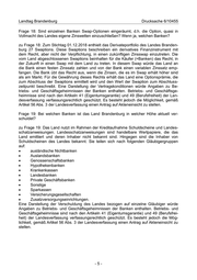 Landtag Brandenburg Drucksache 6/10455 Frage 18: Sind einzelnen Banken Swap-Optionen eingeräumt, d.h. die Option, quasi in Vollmacht des Landes eigene Zinswetten einzuschließen? Wenn ja, welchen Banken? zu Frage 18: Zum Stichtag 01.12.2018 enthielt das Derivateportfolio des Landes Branden- burg 27 Swaptions. Diese Swaptions beschreiben ein derivatives Finanzinstrument mit dem Recht, aber nicht der Verpflichtung, in einen zukünftigen Zinsswap einzutreten. Die vom Land abgeschlossenen Swaptions beinhalten für die Käufer (=Banken) das Recht, in der Zukunft in einen Swap mit dem Land zu treten. In diesem Swap würde das Land an die Bank einen festen Zinssatz zahlen und von der Bank einen variablen Zinssatz emp- fangen. Die Bank übt das Recht aus, wenn die Zinsen, die es im Swap erhält höher sind als am Markt. Für die Gewährung dieses Rechts erhält das Land eine Optionsprämie, die zum Abschluss der Swaptions ermittelt wird und den Wert der Swaption zum Abschluss- zeitpunkt beschreibt. Eine Darstellung der Vertragskonditionen würde Angaben zu Be- triebs- und Geschäftsgeheimnissen der Banken enthalten. Betriebs- und Geschäftsge- heimnisse sind nach den Artikeln 41 (Eigentumsgarantie) und 49 (Berufsfreiheit) der Lan- desverfassung verfassungsrechtlich geschützt. Es besteht jedoch die Möglichkeit, gemäß Artikel 56 Abs. 3 der Landesverfassung einen Antrag auf Akteneinsicht zu stellen. Frage 19: Bei welchen Banken ist das Land Brandenburg in welcher Höhe aktuell ver- schuldet? zu Frage 19: Das Land nutzt im Rahmen der Kreditaufnahme Schuldscheine und Landes- schatzanweisungen. Landesschatzanweisungen sind handelbare Wertpapiere, die das Land emittiert und deren Inhaber nicht bekannt sind. Hingegen sind die Inhaber von Schuldscheinen des Landes bekannt. Sie teilen sich nach folgenden Gläubigergruppen auf: ausländische Nichtbanken Auslandsbanken Genossenschaftsbanken Hypothekenbanken Krankenkassen Landesbanken Private Geschäftsbanken Sonstige Sparkassen Versicherungsgesellschaften Zusatzversorgungseinrichtungen. Eine Darstellung der Verschuldung des Landes bezogen auf einzelne Gläubiger würde Angaben zu Betriebs- und Geschäftsgeheimnissen der Banken enthalten. Betriebs- und Geschäftsgeheimnisse sind nach den Artikeln 41 (Eigentumsgarantie) und 49 (Berufsfrei- heit) der Landesverfassung verfassungsrechtlich geschützt. Es besteht jedoch die Mög- lichkeit, gemäß Artikel 56 Abs. 3 der Landesverfassung einen Antrag auf Akteneinsicht zu stellen. -5-