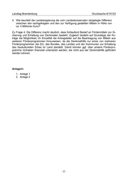Landtag Brandenburg Drucksache 6/10123 4. Wie beurteilt die Landesregierung die vom Landeskonservator dargelegte Differenz zwischen den nachgefragten und den zur Verfügung gestellten Mitteln in Höhe von ca. 4 Millionen Euro? Zu Frage 4: Die Differenz macht deutlich, dass fortlaufend Bedarf an Fördermitteln zur Si- cherung und Erhaltung von Denkmalen besteht. Zugleich besteht auf Grundlage der An- träge die Möglichkeit, im Einzelfall die Antragsteller auf die Beantragung von Mitteln aus weiteren Förderprogrammen hinzuweisen, da die Denkmalhilfe nur eines von mehreren Förderprogrammen der EU, des Bundes, des Landes und der Kommunen zur Erhaltung des baukulturellen Erbes im Land darstellt. Damit können ggf. über andere Förderpro- gramme Vorhaben finanziell unterstützt werden, die nicht aus der Denkmalhilfe gefördert werden können. Anlage/n: 1. Anlage 1 2. Anlage 2 -2-