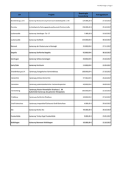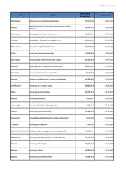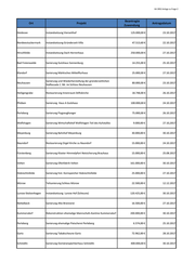 KA 3952 Anlage zu Frage 2 Beantragte Ort Projekt Antragsdatum Zuwendung Heidesee Instandsetzung Vierseithof 125.000,00 € 23.10.2017 Nordwestuckermark Instandsetzung Gründerzeit-Villa 47.513,60 € 22.10.2017 Hirschfelde Instandsetzung Dach Herrenhaus 250.000,00 € 27.10.2017 Bad Freienwalde Sanierung Gutshaus Sonnenburg 14.255,00 € 25.10.2017 Klandorf Sanierung Märkisches Mittelflurhaus 25.000,00 € 27.10.2017 Sanierung und Wiederherstellung der gründerzeitlichen Neuhausen 80.000,00 € 23.10.2017 Südfassada 1. BA im Schloss Neuhausen Heiligengrabe Restaurierung Innenraum Stiftskirche 18.748,00 € 26.10.2017 Phöben Sanierung Haus A Gutshaus 100.000,00 € 24.10.2017 Perleberg Sanierung Flugzeughanger 75.000,00 € 26.10.2017 Wolfshagen Sanierung Wirtschaftshof Wolfshagen Teil des Kuhstalles 9.000,00 € 27.10,2017 Meyenburg Sanierung Bahnhof Meyenburg 30.000,00 € 30.10.2017 Naundorf Restaurierung Orgel Kirche zu Naundorf 15.000,00 € 24.10.2017 Fürstenberg Sanierung Kloster Himmelpfort Notsicherung Brauhaus 15.000,00 € 25.08.2017 Velten Sanierung Ofenfabrik Velten 161.000,00 € 30.10.2017 Hobrechtsfelde Sanierung hist. Kornspeicher Hobrechtsfelde 25.000,00 € 27.10.2017 Mürow Teilsanierung Schloss Mürow 22.500,00 € 12.12.2017 Lunow-Stolzenhagen Instandsetzung Lunow Hof (Scheune) 120.425,00 € 30.10.2017 Nettelbeck Sanierung Alte Brennerei 16.500,00 € 27.10.2017 Kummersdorf Rekonstruktion ehemalige Mannschafs-Kantine Kummersdorf 200.000,00 € 30.10.2017 Perleberg Sanierung ehemalige Fleischerei Perleberg 6.574,00 € 25.10.2017 Gartz Sanierung Tabakscheune Gartz 72.962,00 € 28.10.2017 Schmölln Sanierung Domänenpächterhaus Schmölln 400.000,00 € 30.10.2017