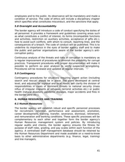employees and to the public. Its observance will be mandatory and made a condition of service. The code of ethics will include a disciplinary chapter which specifies what constitutes misconduct, and the sanctions that apply. 5.8 Oversight and Accountability The border agency will introduce a code of conduct specifying the duties of all personnel. It provides a framework and guidelines covering areas such as what constitutes a conflict of interest, its forms (incompatible functions and activities, restriction on auxiliary activities, acceptance of gifts etc.), how to avoid such conflicts, with whom to consult, reporting lines, and the consequences of a breach. The code of conduct will be published. This is to underline its importance in the eyes of border agency staff and to make the public and partner organisations aware of the border agency’s anti- corruption policy. Continuous analysis of the threats and risks of corruption is mandatory as is regular improvement of procedures to diminish the possibility for corrupt practices. Transparent procedures with proper documentation will make it possible to perform ex post analysis to verify suspected wrongdoing. Procedures will be reviewed and updated at regular intervals. 5.9 Contingency Contingency procedures for situations requiring urgent action (including search and rescue) should be in place. The plans developed at central level, and adjusted for regional and local needs, will clarify the division of responsibilities in cases of imminent threats to national security (mass influx of irregular migrants or refugees, terrorist activities etc.) or public health (natural disasters, pandemic diseases, major accidents and fires in the border zone etc.). 6. HUMAN RESOURCES AND TRAINING 6.1 Human Resources The border agency will establish robust and specific personnel processes for recruitment, retention, performance and assessment, promotion, career development, training, transfer, severance, dismissal, retirement, and remuneration and working conditions. These specific processes will be complementary to each other and together form the border agency’s Human Resources management system and policies. By introducing regular audits and checks, the border agency ensures the fitness for purpose of staff roles, grading, and pay scales within each function of the agency. A centralised staff management database should be retained by the Human Resources Department and made available on a need-to-know basis to other administrative departments (e.g. finance, legal, training) and line managers. 41