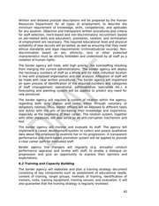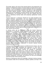 Written and detailed post/job descriptions will be prepared by the Human Resources Department for all types of employment, to describe the minimum requirement of knowledge, skills, competences, and aptitudes for any position. Objective and transparent written procedures and criteria for staff selection, merit-based and non-discriminatory recruitment (based on job-related skills and education), promotion, rotation, and termination of employment are necessary. The required educational level and physical suitability of new recruits will be tested, as well as ensuring that they meet ethical standards and legal requirements (criminal/judicial records). Non- discrimination based on sex, ethnicity, race or other protected characteristics must be strictly forbidden and understood by all staff as a violation of human rights. The border agency will treat, with high priority, the overstaffing resulting from merging the current administrations. The border agency will deploy the necessary numbers of staff as a whole and for each individual location in line with proposed organisation and risk analysis. Allocation of staff will be made with clear written procedures. The border agency will implement an open process of identification of the required numbers and categories of staff (management, operational, administrative, specialists etc.). A forecasting and planning system will be applied to predict any need for new personnel. The border agency will regulate a system of rotation within the agency, regarding both duty station and tasks, either through voluntary or obligatory rotation. Thus, border officers will be exposed to different tasks and duties with the aim of increasing their knowledge and experience, especially at the beginning of their career. The rotation system, together with other measures, will also serve as an anti-corruption mechanism and tool. The border agency will monitor and evaluate its staff. The agency will implement a career development system to collect and assess qualitative data about the employee to examine her or his progression. A transparent performance and merit-based promotion system will be applied to provide a clear career path for motivated staff. Border agency line mangers will regularly (e.g. annually) conduct performance appraisal and review with staff, to enable a dialogue on progression and give an opportunity to express their opinions and expectations. 6.2 Training and Capacity Building The border agency will elaborate and plan a training strategy document consisting of key components such as assessment of educational needs, content of training, target groups, methods of training, identification of trainers, costs, training equipment, training venues, and evaluation. It will also guarantee that the training strategy is regularly reviewed. 42
