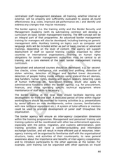 centralised staff management database. All training, whether internal or external, will be properly and sufficiently evaluated to assess all-round effectiveness (e.g. costs, improved job performance etc.) and identify and address any changes that may be necessary. The border agency (i.e. the training entity and the Border Security and Management Academy (with its sub-training centres)) will develop a curriculum on basic border management training. The IBM concept will be an integral part of that programme. An advanced border management training for managers will also be developed, including training on generic management skills. Auxiliary training on topics such as computer and language skills will be included either as part of basic courses or advanced trainings, depending on the level of content. The agency will support deployment of staff on special training courses organised by other countries or international organisations. Training on human rights obligations for border management authorities must be central to all training, and a core element of the basic border management training curriculum. Specialised and advanced courses should be developed, e.g. for second- line checks, crime intelligence, risk analysis and profiling, detection of stolen vehicles, detection of forged and falsified travel documents, detection of people hiding inside vehicles using state-of-the-art devices, dog handlers, human rights, dealing with asylum seekers, detecting cases of human trafficking etc. Specialised training would also apply to administrative functions within the border agency, e.g. for procurement, finances, and those operating specific technical equipment where maintenance of staff skills is necessary. The border agency at the local level should facilitate learning and development for front-line staff. A dedicated period of time within regular working hours should be reserved for training activities (e.g. presentations by senior officers on new developments, online courses, familiarisation with new technical equipment etc.). A system of tutor-officers or mentors could be used to promote development of junior staff throughout the organisation. The border agency will ensure an inter-agency cooperation dimension within the training programmes. Management and personnel training and training systems will be coordinated with other law enforcement agencies, especially with the police, migration, and customs administration. Joint training activities will have a confidence-building and information exchange function, and will result in more efficient use of resources. Inter- agency training will be organised to familiarise staff with the organisational structure, tasks, and activities of their counterparts, to raise general awareness about the importance and benefits of inter-agency cooperation, and to introduce participants to the other agencies at the border. For example, joint training can be organized with other agencies on travel 44