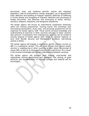documents, visas, and residence permits; asylum and migration legislation; code of conduct/ethics; foreign languages; use of equipment/IT tools; detection and handling of irregular migrants; detection of trafficking in human beings and smuggling of migrants; detection and processing of forged documents; and detection and processing of stolen vehicles, narcotics, weapons, explosives, and dangerous substances. The border agency will ensure an international cooperation dimension within the training programmes. Training events and workshops with international participation, study visits, and exchange programmes will be organised for border agency staff. These events increase knowledge and understanding of practices in other countries and help to foster contacts with partners. Counterparts from neighbouring countries will be invited to training sessions of border agency staff, either at national, regional, or local level (Border Security and Management Academy, sub-training centres or BCPs). The border agency will engage in organising specific training courses on IBM in a multilateral context. This will allow officials from various border services in neighbouring or other countries to learn about the concept of Libyan IBM, as well as to share good practice and experiences. As a result, it will increase knowledge and mutual understanding between countries. The border agency will promote work towards cross-border and regionalised training benchmarks and standards. The sharing of good practices and standardisation of training curricula and material will be encouraged. 45