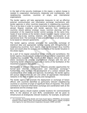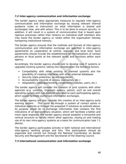 7.2 Inter-agency communication and information exchange The border agency takes appropriate measures to regulate inter-agency communication and information exchange by issuing relevant internal guidance (rules or instruction) on what information is shared and exchanged, how, and with whom. This is to be done to ensure security. In addition, it will result in a system of communication that is based upon rigorous processes rather than reliance on individual staff members who may leave the border agency or rotate within the organisation thereby hampering institutional memory. The border agency ensures that the methods and formats of inter-agency communication and information exchange are specified in inter-agency agreements on cooperation at central, regional, and local level. Such agreements should include the establishment (or formalisation) of contact persons or focal points at the relevant levels and functions within each agency. Accordingly, the border agency should look to develop new IT systems or upgrades existing systems, taking into consideration the following factors: e Compatibility with other existing or planned systems and the possibility of creating interfaces with other external databases «e Security (data protection, access regulation) e Accountability (records of access, usernames, etc.) « Adaptability (adding/amending components/modules, users, etc.). The border agency will consider the creation of joint systems with other agencies (e.g. customs, migration agency, police), such as one overall operating system with sub-modules allocated to each participating agency, which would facilitate authorised information exchanges. The border agency will also consider the creation of an inter-agency early warning system. This could be through a system of contact points in individual agencies or through the proposed IT solutions as outlined above. Its purpose would be to exchange information that contains the first indications of an extraordinary situation, which will facilitate a better and more rapid response. The border agency should establish a horizontal and vertical structure to rapidly inform other agencies, relying on and making use of its own intra-agency systems as a basis for communication (see 7.1 above). The border agency participates actively in both national and international inter-agency working groups and fora. This participation should be organised and carried out through the National Coordinator on Border Security and Management and the Secretariat of the Steering Council. 7.3 International communication and information exchange 48