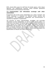 BCPs, shared office space for staff from the border agency, other Libyan agencies, and neighbouring countries, would facilitate operational communication and exchange of information. 7.4 Communication and information exchange with other stakeholders Engagement with private sector stakeholders (e.g. airline, transport, and courier industries) is important for effective border security and management. This engagement (cooperation and communication) is regulated by legislation or agreements. The provision of easily understandable, accessible, and up-to-date information to these stakeholders, as well as to the general public, is a useful tool in this regard. The border agency should provide information on issues relevant for crossing the state border. Information provided to stakeholders and the public may be in the form of public notice boards at BCPs or through brochures and posters. A public visibility mechanism, principally through a border agency website, would further strengthen the dissemination of relevant and useful information. 50