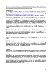 Landtag Brandenburg Drucksache 6/890 6. Wahlperiode Antwort der Landesregierung auf die Kleine Anfrage 282 der Abgeordneten Iris Schülzke fraktionslos Drucksache 6/615 Brand- und Unfallschutz bei Windkraftanlagen im Wald Wortlaut der Kleinen Anfrage 282 vom 13.02.2015: Bei der Erteilung von Baugenehmigungen für Windenergieanlagen im Wald scheint es unterschiedliche Richtlinien bei der Sicherstellung des präventiven Brandschutzes zu geben. Auch sind die Verkehrserschließung und der Zugang zu Löschwasser bei Windparks im Wald unerlässlich. Dies betrifft besonders ein für Schwerlastverkehr befahrbares Wegenetz, welches Voraussetzung für ein standortspezifisches Brand- schutzkonzept ist. Dieses muss planerische, abwehrende, anlagentechnische und organisatorische Brandschutzmaßnahmen umfassen. Üblicherweise können brennende WEA nicht gelöscht werden, da die Feuerwehren nicht über eine Ausrüstung für die Brandbekämpfung in großen Höhen verfügen. Die Feuerwehren bleiben stattdessen auf Abstand, lassen die WEA abbrennen und ver- suchen, außerhalb des Sicherheitsabstands eine Ausbreitung des Brandes auf die Umgebung zu verhindern. Hierzu benötigen sie Zufahrtswege, die die Umgebung in alle Richtungen abdecken. Im Gegensatz zum Windpark in Großräschen verfügt der Windpark Ölsig-Buchhain nicht über ein Ringwegenetz, das für Schwerlastverkehr geeignet ist. Bisher wurden nur jeweils Zufahrten zu den einzelnen Windkraftanlagen hergestellt. Die übrigen Waldwege sind – auch durch den Verkehr, der durch die Wartungsfahrzeuge entsteht – teilweise unbefahrbar für Feuerwehrfahrzeuge. Die Löschwasserversorgung soll über Tiefbrunnen erfolgen, wobei zusätzliche Ag- gregate erforderlich sind, um im Brandfall Löschwasser zur Verfügung zu haben. Freiwillige Feuerwehren verfügen in der Regel nicht über die erforderlichen Aggrega- te und auch nicht über die notwendigen Dieselvorräte um bei großen Waldbränden die Tiefbrunnen zu nutzen. Der Presse war zu entnehmen, dass Teile von brennenden Windkraftanlagen bis zu 400 m entfernt herabstürzen. Die Kiefernwälder im Gebiet Ölsig-Buchhain sind in die höchste Brandgefährdungsklasse eingestuft. Von der Gefahr durch herabstürzende Teile sind auch Nachbargrundstücke betroffen. Deren Waldbestand ist somit einer erheblichen zusätzlichen Brandgefahr, die durch Blitzschlag, technische Defekte an den WEA oder ähnliches verursacht werden kann, ausgesetzt. Ich frage die Landesregierung: Datum des Eingangs: 16.03.2015 / Ausgegeben: 23.03.2015