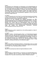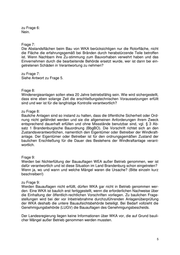 zu Frage 6: Nein. Frage 7: Die Abstandsflächen beim Bau von WKA berücksichtigen nur die Rotorfläche, nicht die Fläche die erfahrungsgemäß bei Bränden durch herabstürzende Teile betroffen ist. Wenn Nachbarn ihre Zu-stimmung zum Bauvorhaben verwehrt haben und das Einvernehmen durch die bearbeitende Behörde ersetzt wurde, wer ist dann bei ein- getretenen Schäden in Verantwortung zu nehmen? zu Frage 7: Siehe Antwort zu Frage 5. Frage 8: Windenergieanlagen sollen etwa 20 Jahre betriebsfähig sein. Wie wird sichergestellt, dass eine eben solange Zeit die erschließungstechnischen Voraussetzungen erfüllt sind und wer ist für die langfristige Kontrolle verantwortlich? zu Frage 8: Bauliche Anlagen sind so instand zu halten, dass die öffentliche Sicherheit oder Ord- nung nicht gefährdet werden und sie die allgemeinen Anforderungen ihrem Zweck entsprechend dauerhaft erfüllen und ohne Missstände benutzbar sind, vgl. § 3 Ab- satz 1 Brandenburgische Bauordnung (BbgBO). Die Vorschrift richtet sich an den Zustandsverantwortlichen, namentlich den Eigentümer oder Betreiber der Windkraft- anlage. Der Eigentümer oder Betreiber ist für den ordnungsgemäßen Zustand der baulichen Erschließung für die Dauer des Bestehens der Windkraftanlage verant- wortlich. Frage 9: Werden bei Nichterfüllung der Bauauflagen WEA außer Betrieb genommen, wer ist dafür verantwortlich und ist diese Situation im Land Brandenburg schon eingetreten? Wenn ja, wo und wann und welche Mängel waren die Ursache? (Bitte einzeln kurz beschreiben!) zu Frage 9: Werden Bauauflagen nicht erfüllt, dürfen WKA gar nicht in Betrieb genommen wer- den. Eine WKA ist baulich erst fertiggestellt, wenn die erforderlichen Nachweise über die Einhaltung der öffentlich-rechtlichen Vorschriften vorliegen. Zu baulichen Frage- stellungen wird bei der vor Inbetriebnahme durchzuführenden Anlagenüberprüfung der WKA deshalb die untere Bauaufsichtsbehörde beteiligt. Bei Bedarf vollzieht die Genehmigungsbehörde (LUGV) die Bauauflagen des Genehmigungsbescheids. Der Landesregierung liegen keine Informationen über WKA vor, die auf Grund bauli- cher Mängel außer Betrieb genommen werden mussten.
