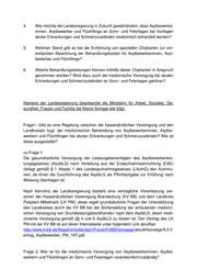 4. Wie möchte die Landesregierung in Zukunft gewährleisten, dass Asylbewerbe- rinnen, Asylbewerber und Flüchtlinge an Sonn- und Feiertagen bei Vorliegen akuter Erkrankungen und Schmerzzuständen medizinisch behandelt werden? 5. Welchen Stand gibt es bei der Einführung von speziellen Chipkarten zur ver- einfachten Abrechnung der Behandlungskosten für Asylbewerberinnen, Asyl- bewerber und Flüchtlinge? 6. Welche Behandlungsleistungen können mithilfe dieser Chipkarten in Anspruch genommen werden? Wird dazu auch die medizinische Versorgung bei akuten Erkrankungen und Schmerzzuständen an Sonn- und Feiertagen gehören? Namens der Landesregierung beantwortet die Ministerin für Arbeit, Soziales, Ge- sundheit, Frauen und Familie die Kleine Anfrage wie folgt: Frage1: Gibt es eine Regelung zwischen der kassenärztlichen Vereinigung und den Landkreisen bzgl. der medizinischen Behandlung von Asylbewerberinnen, Asylbe- werbern und Flüchtlingen bei akuten Erkrankungen und Schmerzzuständen? Wie ist diese ausgestaltet? zu Frage 1: Die gesundheitliche Versorgung der Leistungsberechtigten des Asylbewerberleis- tungsgesetzes (AsylbLG) nach Verteilung aus der Erstaufnahmeeinrichtung (EAE) obliegt gemäß § 1 Absatz 1 des Landesaufnahmegesetzes (LAufnG) den Kommu- nen, da ihnen die Durchführung des AsylbLG als Pflichtaufgabe zur Erfüllung nach Weisung übertragen ist. Nach Kenntnis der Landesregierung besteht eine vertragliche Vereinbarung zwi- schen der Kassenärztlichen Vereinigung Brandenburg (KV BB) und dem Landkreis Potsdam-Mittelmark (LK PM); diese regelt grundsätzliche Fragen der Unterstützung des Landkreises durch die KV BB bei der Sicherstellung der ambulanten medizini- schen Versorgung von Grundleistungsbeziehenden nach dem AsylbLG, deren medi- zinische Versorgung gemäß §§ 4 und 6 AsylbLG zu leisten ist. Der Vertrag des LK PM mit der KV BB ist auf deren Internetseite unter folgendem Link abrufbar: http://www.kvbb.de/fileadmin/kvbb/dam/Praxis/KVBBVertraege/aktuell/sonstige/9.3.V ertrag_Asylbewerber_PM_1NT.pdf. Frage 2: Wer ist für die medizinische Versorgung von Asylbewerberinnen, Asylbe- werbern und Flüchtlingen an Sonn- und Feiertagen verantwortlich/zuständig?