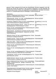 genannt. Daher entspricht die Anzahl der betreffenden Schulen insgesamt nicht der Summe der Anzahl der Schulen in den einzelnen Kategorien. An den folgenden 36 Förderschulen lernen Kinder und Jugendliche mit autistischem Verhalten und einem weiteren im Feststellungsverfahren bestätigten Förderschwerpunkt: Schulname Ort Schule im Nibelungenviertel Schule mit dem sonderpäda- Bernau bei Berlin gogischen Förderschwerpunkt "Lernen" Robinsonschule Schule mit dem sonderpädagogischen Bernau bei Berlin Förderschwerpunkt "geistige Entwicklung" Havelschule Städtische Schule mit dem sonderpädagogi- Brandenburg an der Ha- schen Förderschwerpunkt "geistige Entwicklung" vel Johann-Heinrich-Pestalozzi-Schule - Schule mit dem son- Brandenburg an der Ha- derpädagogischen Förderschwerpunkt "Lernen" vel Schule mit dem sonderpädagogischen Förderschwerpunkt Cottbus "geistige Entwicklung" Spreeschule Bauhausschule - Grundschule und Schule mit dem sonder- Cottbus pädagogischen Förderschwerpunkt "körperliche und moto- rische Entwicklung" Märkische Schule mit dem sonderpädagogischen Förder- Eberswalde schwerpunkt "geistige Entwicklung" Pestalozzi-Schule - Schule mit dem sonderpädagogischen Eisenhüttenstadt Förderschwerpunkt „geistige Entwicklung“ "Stark fürs Leben" - Schule mit dem sonderpädagogischen Elsterwerda Förderschwerpunkt „geistige Entwicklung“ Schule mit dem sonderpädagogischen Förderschwerpunkt Elsterwerda "Lernen" Elsterwerda Schule mit dem sonderpädagogischen Förderschwerpunkt Erkner "Lernen" Schule mit dem sonderpädagogischen Förderschwerpunkt Finsterwalde "geistige Entwicklung" Sieben Brunnen Finsterwalde Lessingschule Schule mit dem sonderpädagogischen För- Frankfurt (Oder) derschwerpunkt „Lernen“ HANSA-SCHULE Schule mit dem sonderpädagogischen Frankfurt (Oder) Förderschwerpunkt "geistige Entwicklung" Regine-Hildebrandt-Schule Schule mit dem sonderpädago- Fürstenwalde/Spree gischen Förderschwerpunkt „geistige Entwicklung“ Fürs- tenwalde/Erkner Schule mit dem sonderpädagogischen Förderschwerpunkt Fürstenwalde/Spree „Lernen“ Erich Kästner Regenbogenschule Hennigsdorf Schule mit dem sonderpä- Hennigsdorf dagogischen Förderschwerpunkt "geistige Entwicklung" Margeriten-Schule Borgsdorf Hohen Neuendorf/OT Borgsdorf