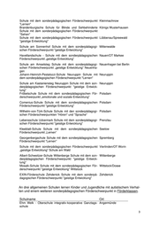 Schule mit dem sonderpädagogischen Förderschwerpunkt Kleinmachnow "Lernen" Brandenburgische Schule für Blinde und Sehbehinderte Königs Wusterhausen Schule mit dem sonderpädagogischen Förderschwerpunkt "Sehen" Schule mit dem sonderpädagogischen Förderschwerpunkt Lübbenau/Spreewald "geistige Entwicklung" Schule am Sonnenhof Schule mit dem sonderpädagogi- Mittenwalde schen Förderschwerpunkt "geistige Entwicklung" Havellandschule - Schule mit dem sonderpädagogischen Nauen/OT Markee Förderschwerpunkt „geistige Entwicklung“ Schule am Amselsteg Schule mit dem sonderpädagogi- Neuenhagen bei Berlin schen Förderschwerpunkt „geistige Entwicklung“ Neuenha- gen Johann-Heinrich-Pestalozzi-Schule Neuruppin Schule mit Neuruppin dem sonderpädagogischen Förderschwerpunkt "Lernen" Schule am Kastaniensteg Neuruppin Schule mit dem son- Neuruppin derpädagogischen Förderschwerpunkt "geistige Entwick- lung" Fröbelschule Schule mit dem sonderpädagogischen För- Potsdam derschwerpunkt „emotionale und soziale Entwicklung“ Comenius-Schule Schule mit dem sonderpädagogischen Potsdam Förderschwerpunkt "geistige Entwicklung" Wilhelm-von-Türk-Schule Schule mit den sonderpädagogi- Potsdam schen Förderschwerpunkten "Hören" und "Sprache" Lebensschule Uckermark Schule mit dem sonderpädagogi- Prenzlau schen Förderschwerpunkt "geistige Entwicklung" Kleeblatt-Schule Schule mit dem sonderpädagogischen Seelow Förderschwerpunkt „Lernen“ Georgenbergschule Schule mit dem sonderpädagogischen Spremberg Förderschwerpunkt "Lernen" Schule mit dem sonderpädagogischen Förderschwerpunkt Vierlinden/OT Worin „geistige Entwicklung“ Schule am Wald Albert-Schweitzer-Schule Wittenberge Schule mit dem son- Wittenberge derpädagogischen Förderschwerpunkt "geistige Entwick- lung" Mosaik-Schule Schule mit dem sonderpädagogischen För- Wittstock/Dosse derschwerpunkt "geistige Entwicklung" Wittstock EXIN-Förderschule Zehdenick Schule mit dem sonderpä- Zehdenick dagogischen Förderschwerpunkt "geistige Entwicklung" An drei allgemeinen Schulen lernen Kinder und Jugendliche mit autistischem Verhal- ten und einem weiteren sonderpädagogischen Förderschwerpunkt in Förderklassen. Schulname Ort Ehm Welk - Oberschule integrativ-kooperative Ganztags- Angermünde schule