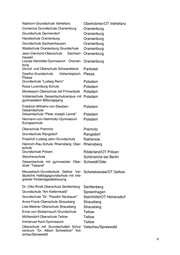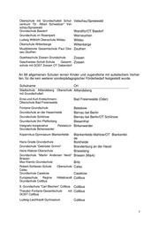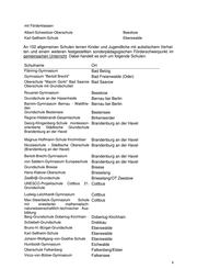 Nashorn-Grundschule Vehlefanz Oberkrämer/OT Vehlefanz Comenius Grundschule Oranienburg Oranienburg Neddermeyer-Grundschule Schmach- Oranienburg/OT Schmachtenhagen tenhagen Karl-Eduard von Lingenthal-Oberschule Ortrand Ortrand mit integrierter Grundschule Europaschule Grund- und Oberschule Schwanebeck Panketal Zeppelin-Grundschule Potsdam Grundschule im Bornstedter Feld Potsdam Karl-Foerster-Schule Städtische Grund- Potsdam schule Potsdam Schule am Griebnitzsee Potsdam Montessori-Oberschule mit Primarstufe Potsdam Friedrich-Wilhelm-von-Steuben- Potsdam Gesamtschule Humboldt-Gymnasium Potsdam Bertha-von-Suttner-Gymnasium Ba- Potsdam belsberg Oberschule Premnitz Premnitz Diesterweg-Grundschule Prenzlau Oberschule Rangsdorf Rangsdorf Fontane-Gymnasium Landkreis Teltow- Rangsdorf Fläming Sitz Rangsdorf Otto-Seeger-Grundschule Rathenow Rathenow West Grundschule "Schule des Friedens" Rietz-Neuendorf/OT Görzig Grund- und Oberschule Rüdersdorf Rüdersdorf bei Berlin Grundschule "Blauer Planet" Annahütte Schipkau/OT Annahütte Schule Finowfurt Schorfheide/OT Finowfurt Grundschule Schwarzheide-Wandelhof Schwarzheide Astrid Lindgren Grundschule Schwedt/Oder Dreiklang Oberschule Schwedt/Oder Grundschule "Albert Einstein" Schwie- Schwielowsee/OT Caputh lowsee OT Caputh Kreis Potsdam- Mittelmark Walther-Rathenau-Grundschule Senftenberg Bernhard-Kellermann-Oberschule Senf- Senftenberg tenberg Dr.-Otto-Rindt-Oberschule Senftenberg Senftenberg Friedrich-Engels-Gymnasium Senftenberg Grundschule Geschwister Scholl Spremberg/OT Schwarze Pumpe Grundschule am Wäldchen Strausberg Oberschule Templin Templin
