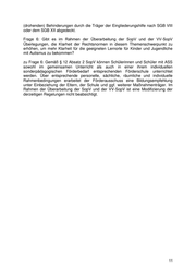 (drohenden) Behinderungen durch die Träger der Eingliederungshilfe nach SGB VIII oder dem SGB XII abgedeckt. Frage 6: Gibt es im Rahmen der Überarbeitung der SopV und der VV-SopV Überlegungen, die Klarheit der Rechtsnormen in diesem Themenschwerpunkt zu erhöhen, um mehr Klarheit für die geeigneten Lernorte für Kinder und Jugendliche mit Autismus zu bekommen? zu Frage 6: Gemäß § 12 Absatz 2 SopV können Schülerinnen und Schüler mit ASS sowohl im gemeinsamen Unterricht als auch in einer ihrem individuellen sonderpädagogischen Förderbedarf entsprechenden Förderschule unterrichtet werden. Über entsprechende personelle, sächliche, räumliche und individuelle Rahmenbedingungen erarbeitet der Förderausschuss eine Bildungsempfehlung unter Einbeziehung der Eltern, der Schule und ggf. weiterer Maßnahmenträger. Im Rahmen der Überarbeitung der SopV und der VV-SopV ist eine Modifizierung der derzeitigen Regelungen nicht beabsichtigt.