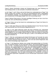 Landtag Brandenburg Drucksache 6/10853 Frage 8: Welche Sicherheiten müssten bei Probebohrungen bzw. einer Förderung von Gas hinterlegt werden um alle eventuellen Umweltrisiken abzudecken? zu den Fragen 7 und 8: Hierzu wird auf die Antwort der Landesregierung zu Frage 7 der Kleinen Anfrage 4242 verwiesen. Die Höhe der Sicherheitsleistung steht in Abhängigkeit zum eigentlichen bohrplatz- und bohrungsgebundenen Vorhaben und kann aktuell auf- grund ausstehender Ermittlungsgrundlagen noch nicht veranschlagt werden. Frage 9: Welcher Ertrag würde im Fall einer zukünftigen Förderung von Gas in den Kom- munen bzw. dem Land Brandenburg verbleiben? zu Frage 9: Hierzu wird auf die Antwort der Landesregierung zu Frage 6 der Kleinen An- frage 4077 verwiesen. Frage 10: Hält Jasper Resources GmbH eine Werksfeuerwehr für den Fall einer Havarie oder eines Brandes durch die kommende Erdgasförderung vor? zu Frage 10: Die Jasper Resources GmbH hält keine anerkannte bzw. angeordnete Werksfeuerwehr gemäß § 30 des Brandenburgischen Brand- und Katastrophenschutzge- setzes (BbgBKG) vor. Zum jetzigen Zeitpunkt liegt dem LBGR kein Antrag zur Gewinnung von Kohlenwasserstoffen vor. Erst dann wäre ggf. zu prüfen, ob die Bildung einer Werks- feuerwehr erforderlich ist. Frage 11: Sieht die Landesregierung die lokalen Einrichtungen der Feuerwehr als ausrei- chend ausgestattet und geschult an für den Fall einer Havarie oder eines Brandes durch die in Aussicht stehende Förderung? Wenn ja, woran wird das konkret festgemacht, falls nein, welche Schlussfolgerungen ergeben sich? zu Frage 11: Die Eigentümer, Besitzer oder sonstige Nutzungsberechtigte von Grundstü- cken und baulichen Anlagen mit einer besonderen Brand- oder Explosionsgefährdung sind nach § 14 Abs. 1 Brandenburgisches Brand- und Katastrophenschutzgesetz (BbgBKG) verpflichtet, die Aufgabenträger bei der Vorbereitung der Gefahrenabwehr besonders zu unterstützen. Die Aufgabenträger sind gemäß § 3 Abs. 1 des BbgBKG dazu verpflichtet, eine leistungsfähige Feuerwehr zu unterhalten. Mit dem Antrag auf Bohrtätigkeiten wird die Jasper Resources GmbH dem LBGR einen Gefahrenabwehrplan vorgelegen müssen. Es wird davon ausgegangen, dass die lokalen Einrichtungen der Feuerwehren und weiterer Rettungskräfte angemessen ausgestattet und den Anforderungen entsprechend vorberei- tet werden. -5-