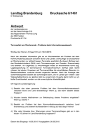 Landtag Brandenburg Drucksache 6/1461 6. Wahlperiode Antwort der Landesregierung auf die Kleine Anfrage 518 des Abgeordneten Thomas Jung der AfD-Fraktion Drucksache 6/1154 Terrorgefahr am Wochenende - Probleme beim Informationsaustausch Wortlaut der Kleinen Anfrage 518 vom 16.04.2015: Nach der aktuellen Information gibt es an Wochenenden ein Problem bei dem Kommunikationsaustausch zwischen Bund und Länder. Demzufolge ist Deutschland an Wochenenden nur schlecht gegen Terrorakte geschützt. Zu diesem Schluss kam das Bundeskriminalamt (BKA) nach Terrorwarnungen von Dresden, Braunschweig und Bremen. Im Gegensatz zu Wochentagen findet an Wochenende keine sog. Lagebesprechung im Gemeinsamen Terrorabwehrzentrum (GTAZ) statt. Somit müssen bei akuten Hinweisen auf Terroranschläge die einschlägigen Beamten im Bereitschaftsdienst zunächst einzeln angerufen werden. Nach der Aussage des Sicherheitsexperten besteht die Schwierigkeit darin, die 16 Länder per Telefon- oder Videoschaltkonferenz zur gleichen Zeit zu versammeln. Es gehe damit nicht nur um bloße Erreichbarkeit, sondern um die unverzügliche Arbeitsfähigkeit. Ich frage die Landesregierung: 1.) Besteht das oben genannte Problem bei dem Kommunikationsaustausch zwischen Bund und Land Brandenburg? Wenn ja, seit wann besteht dieses Problem? 2.) Wurden bereits Maßnahmen zur Bekämpfung dieses Problems eingeleitet? Wenn ja, welche ? 3.) Besteht ein Problem bei dem Kommunikationsaustausch zwischen Land Brandenburg und anderen Bundesländern in Bezug auf das obige Thema? 4.) Wie viele Hinweise bzw. Warnungen eines Terroranschlages gab es in den letzten 10 Jahren im Land Brandenburg insgesamt?