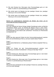 Frage 7: Wie schnell waren die Beamten bei dem jeweiligen Hinweis bzw. jeweiligen Warnung vor Ort an einem Wochenende? zu den Fragen 1 bis 7: In den letzten zehn Jahren gab es keine das Land Brandenburg betreffenden Warnungen vor einem Terroranschlag. Die Kommunikationswege zwischen dem Bund und den Ländern sind für solche Fälle abgestimmt.