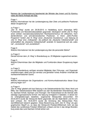 Namens der Landesregierung beantwortet der Minister des Innern und für Kommu- nales die Kleine Anfrage wie folgt: Frage 1: Welche Informationen hat die Landesregierung über Ziele und politische Positionen dieser Gruppierung? zu Frage 1: „Der III. Weg“ wurde am 28.09.2013 in Heidelberg durch ehemalige NPD- Funktionäre und Neonationalsozialisten gegründet. Ideologisch vertritt „Der III. Weg“ einen strikten neonationalsozialistischen Rechtsextremismus mit völkischen, frem- denfeindlichen und anti-demokratischen Positionen. In ihrem „Zehn-Punkte- Programm“ fordert „Der III. Weg“ einen „Deutschen Sozialismus“. Laut Satzung ist „Der III. Weg“ eine „Volkspartei“, die politisch die „Deutsche Volksherrschaft“ und wirtschaftlich die „Deutsche Volkswirtschaft“ anstrebt. Er bezeichnet sich als „natio- nal“, „revolutionär“ und „sozialistisch“. Frage 2: Welche Informationen hat die Landesregierung über die personelle Stärke? zu Frage 2: Derzeit können dem „III. Weg“ in Brandenburg ca. 25 Mitglieder zugerechnet werden. Frage 3: Welche Erkenntnisse über die Mitglieder und Funktionäre dieser Gruppierung liegen vor? zu Frage 3: Im Land Brandenburg verfügen einzelne Mitglieder über Führungs- und Organisati- onserfahrungen; diese sind gut vernetzt und genießen hohes Ansehen innerhalb der rechtsextremistischen Szene. Frage 4: Welche Informationen die Organisations- und Kommunikationsstruktur dieser Grup- pierung liegen vor? zu Frage 4: „Der III. Weg“ gliedert sich laut Satzung in die Gebietsverbände Süd, West, Nord und Mitte. Der Gebietsverband Mitte besteht aus den Bundesländern Brandenburg, Ber- lin, Sachsen-Anhalt, Sachsen und Thüringen. Der Kreisverband ist die kleinste selb- ständige organisatorische Einheit. Die Satzung ermöglicht in Gebieten, in denen kei- ne Untergliederungen bestehen, sogenannte Stützpunkte einzurichten. Am 29.03.2015 wurde der Stützpunkt Berlin gegründet, der die Stadt Berlin und ihr Um- land umfasst. Am 18.04.2015 wurde die Gründung des Stützpunktes Pots- dam/Mittelmark bekannt gegeben. Diese Bezeichnung sieht „Der III. Weg“ als geo- graphischen Begriff an, so dass der Stützpunkt Potsdam/Mittelmark mehr als das Gebiet des Landkreises Potsdam-Mittelmark umfasst und bis in das übrige Branden- burg sowie das Land Sachsen-Anhalt wirken soll.